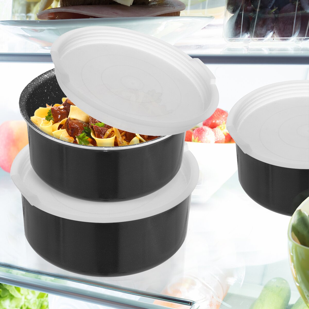 Keď chcete vložiť uvarený vychladnutý pokrm v hrnci Grande Combi do chladničky, použite praktické viečko. Pokrm nenatiahne pachy z chladničky, neoschne a nesplesní.