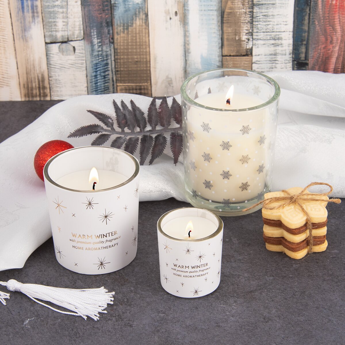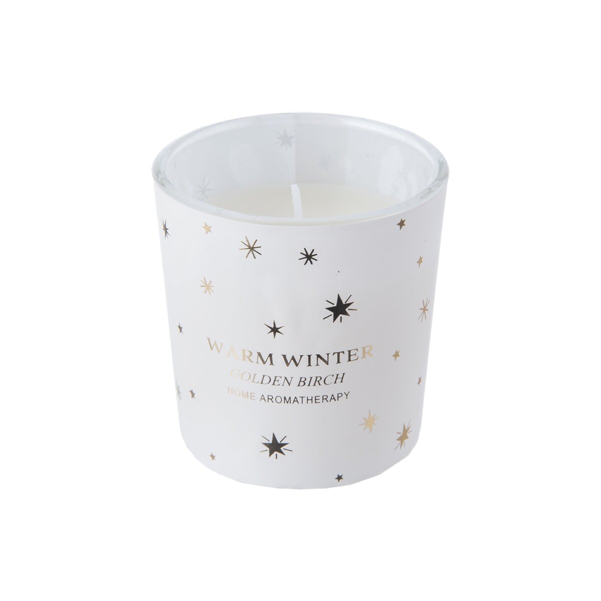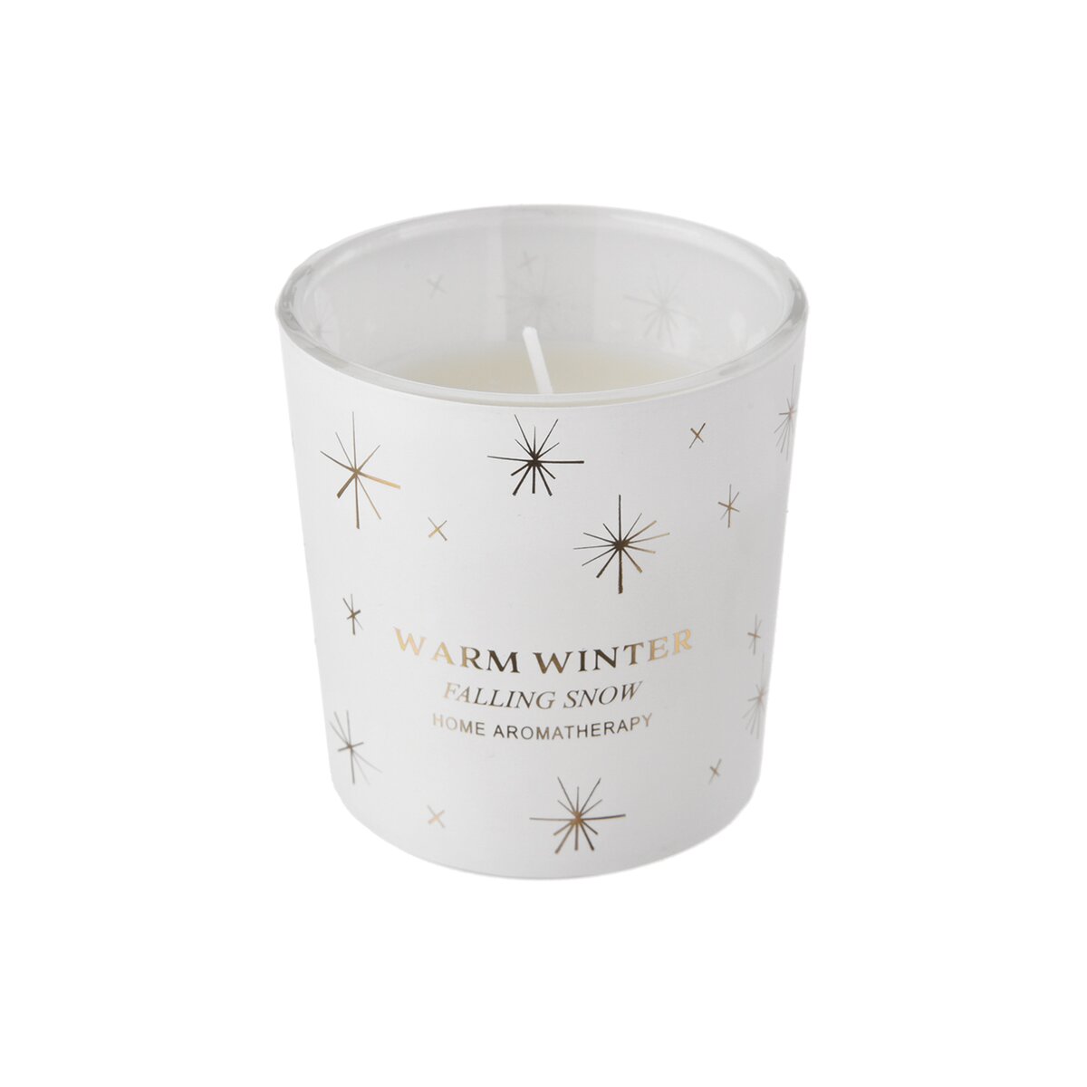 Sviečka z vosku má bavlnený knôt a je vsadená do skleneného obalu, zdobeného dekorom snehových vločiek.