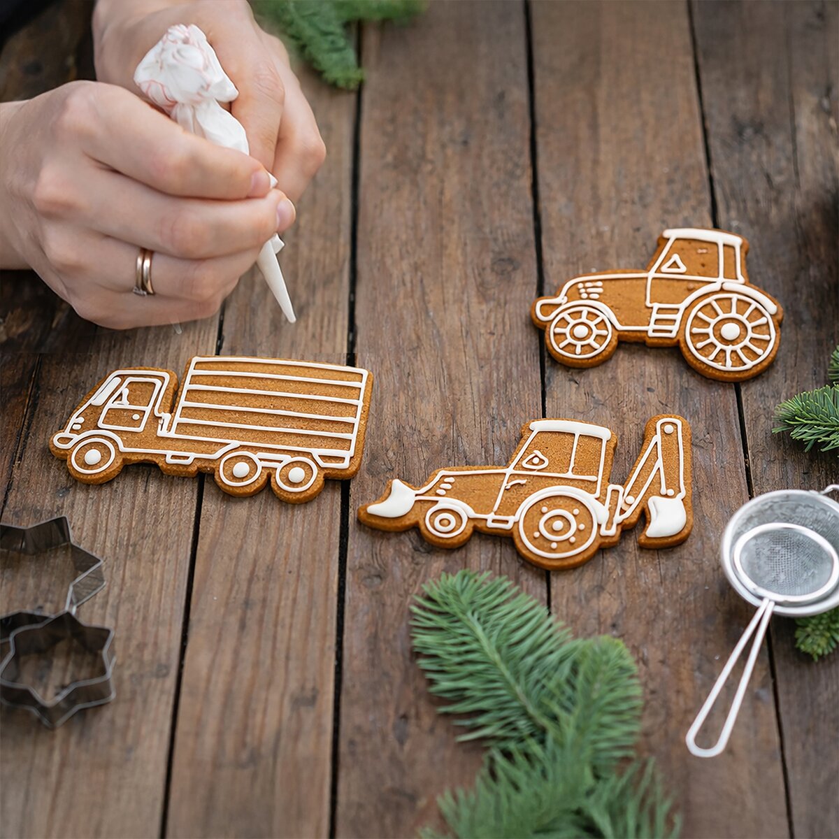 Kód produktu 132628Sada vykrajovačiek vám umožní vytvoriť si doma voňavé perníčky. Sada obsahuje 3 tvary: traktor, bager a nákladné auto. Súčasťou balenia je recept. Materiál: nehrdzavejúca oceľ. Rozmery: 6,2x4,8x1,5 cm, 9,2x4,7x1,5 cm a 7,8x3,7x1,5 cm. Vhodné do umývačky riadu.