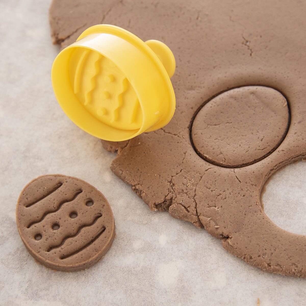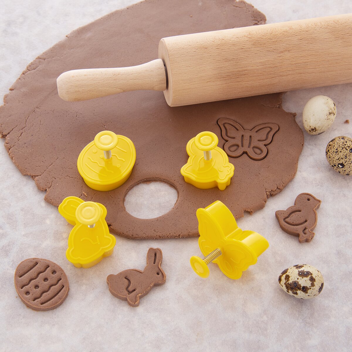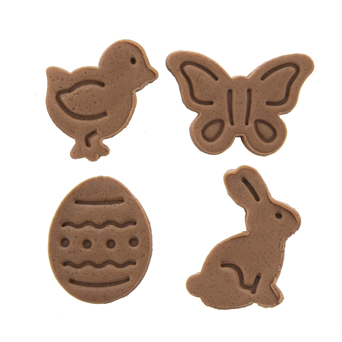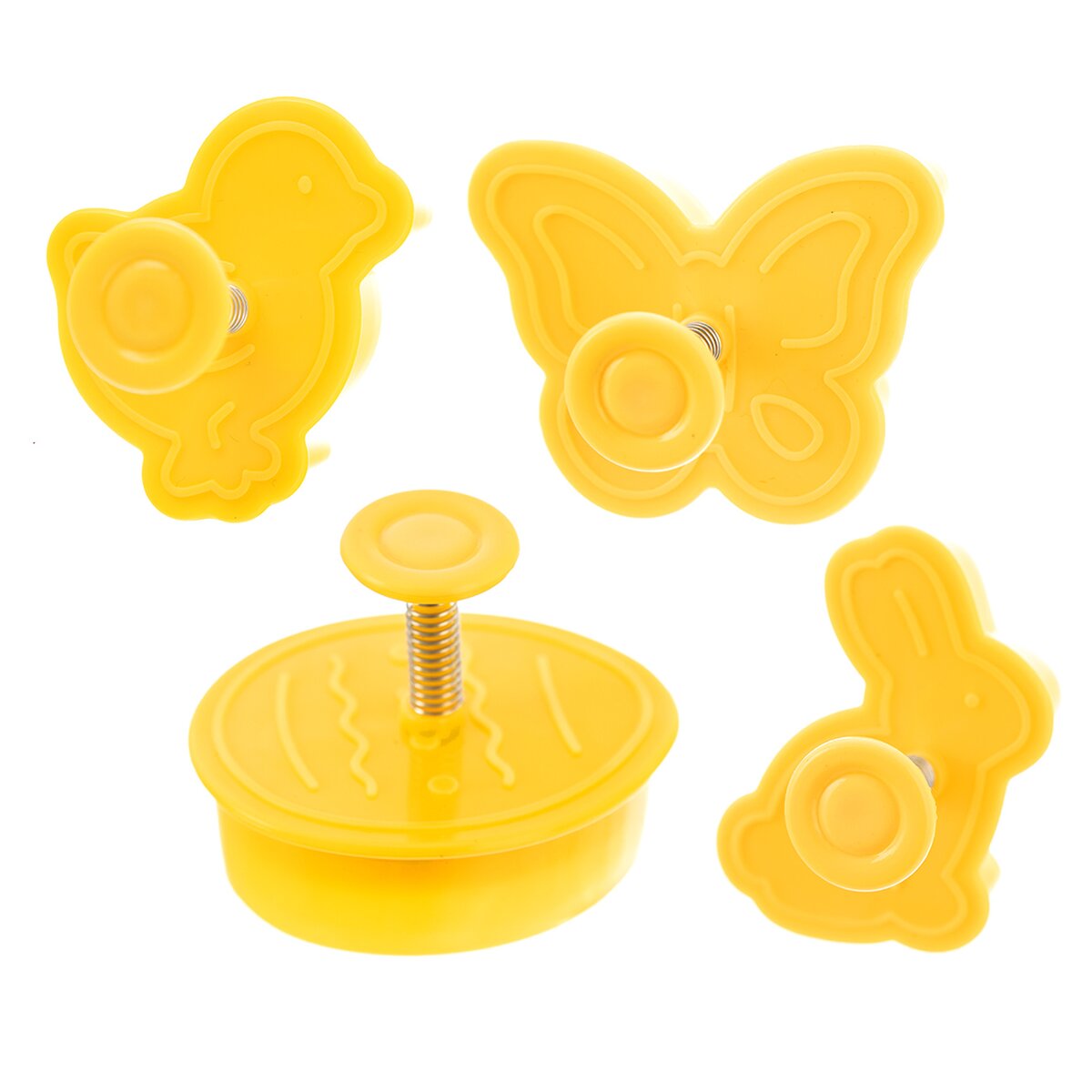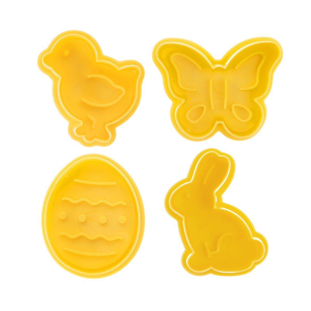 Kód produktu 127453Sada 4 kusov plastových vykrajovačiek, opatrených piestom s plochou, ktorá odtlačí veľkonočný reliéf do vyvaľkaného cesta.