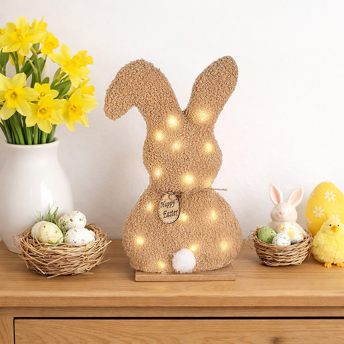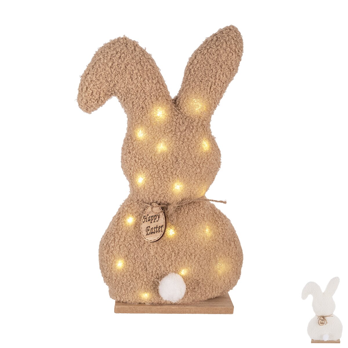 Kód produktu 351925Dekoratívny zajac krásne doplní veľkonočnú výzdobu a dodá interiéru sviežu jarnú náladu. Jemné LED svetlo zútulní váš domov a vnesie doň hrejivý nádych prichádzajúcej jari. Milá a útulná dekorácia pre každý domov. Vhodná ako darček pre vašich blízkych. Materiál: polyester, MDF, PVC. Napájanie pomocou 2 gombíkových batérií CR2032, ktoré sú súčasťou balenia. Len na vnútorné použitie. Rozmery: š. 16,5 cm, v. 31 cm. Mix farieb.