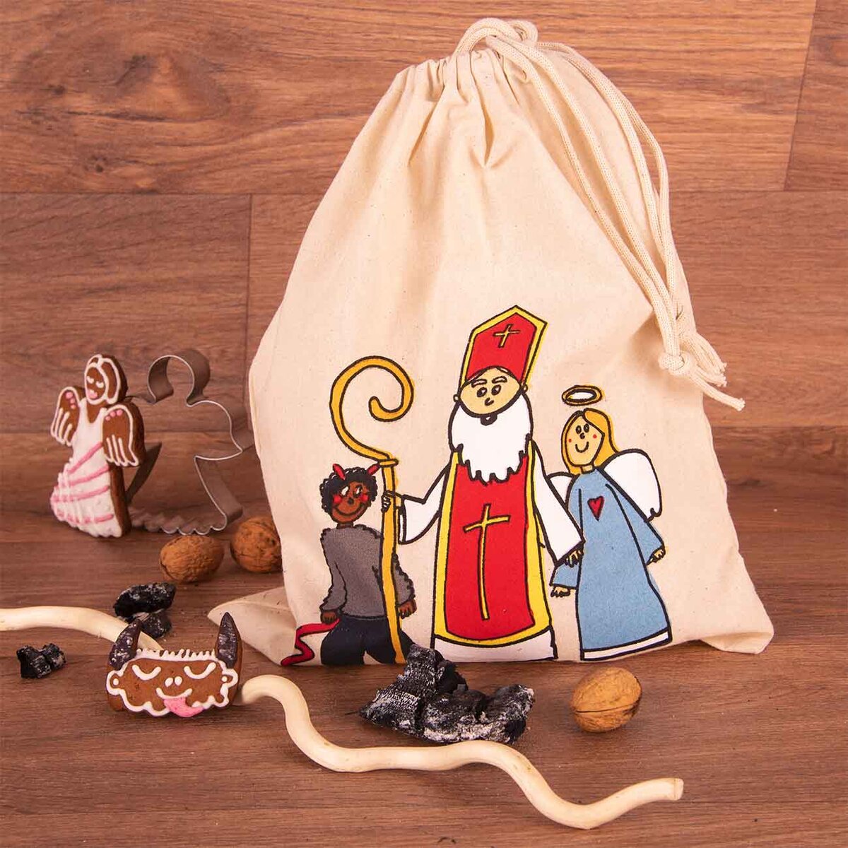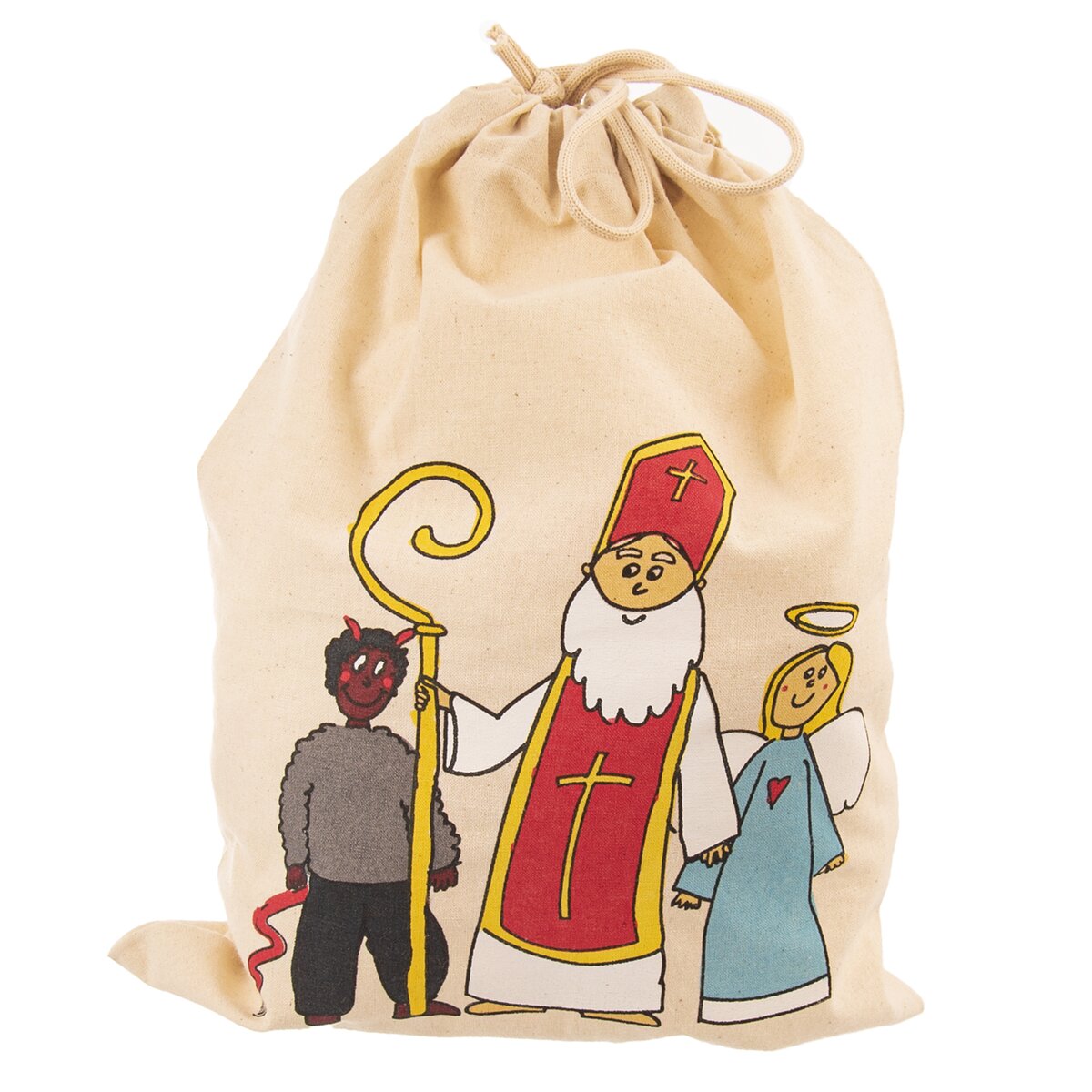 Kód produktu 750653Zaťahovacie bavlnené vrecko s motívom Mikuláša, anjela a čerta pre bohatú nádielku, dobrôt, ovocia, ale napríklad aj zemiakov a uhlia.