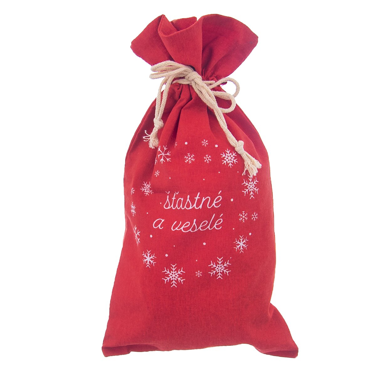 Látkové červené vrecko s dekorom vločiek a nápisom ŠŤASTNÉ A VESELÉ je určené na uloženie fľaše vína alebo iného obľúbeného alkoholu, ale aj na ďalšie drobnosti alebo tzv. mäkké darčeky, ktoré sa zle balia do baliaceho papiera. A na rozdiel od papiera ho možno používať opakovane.