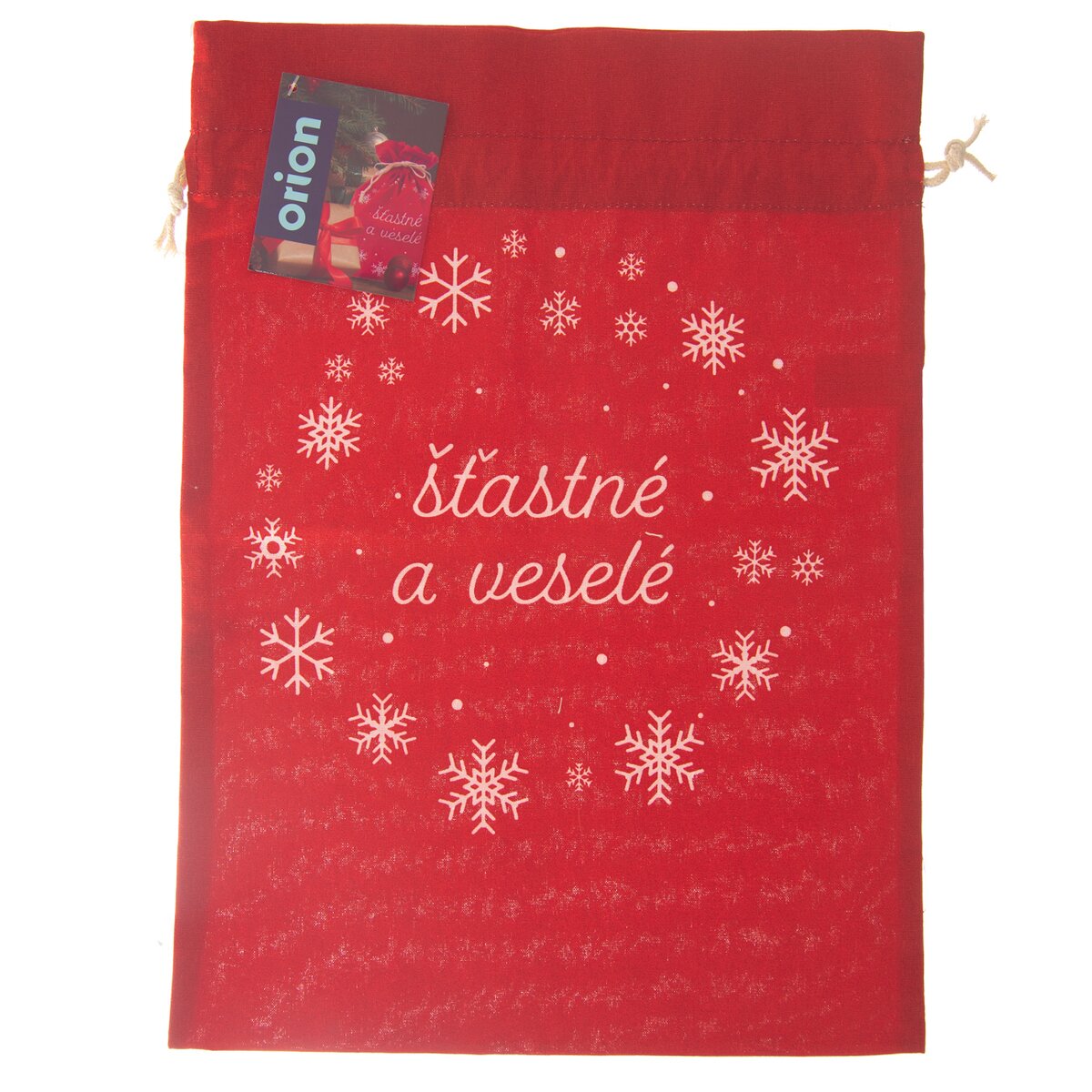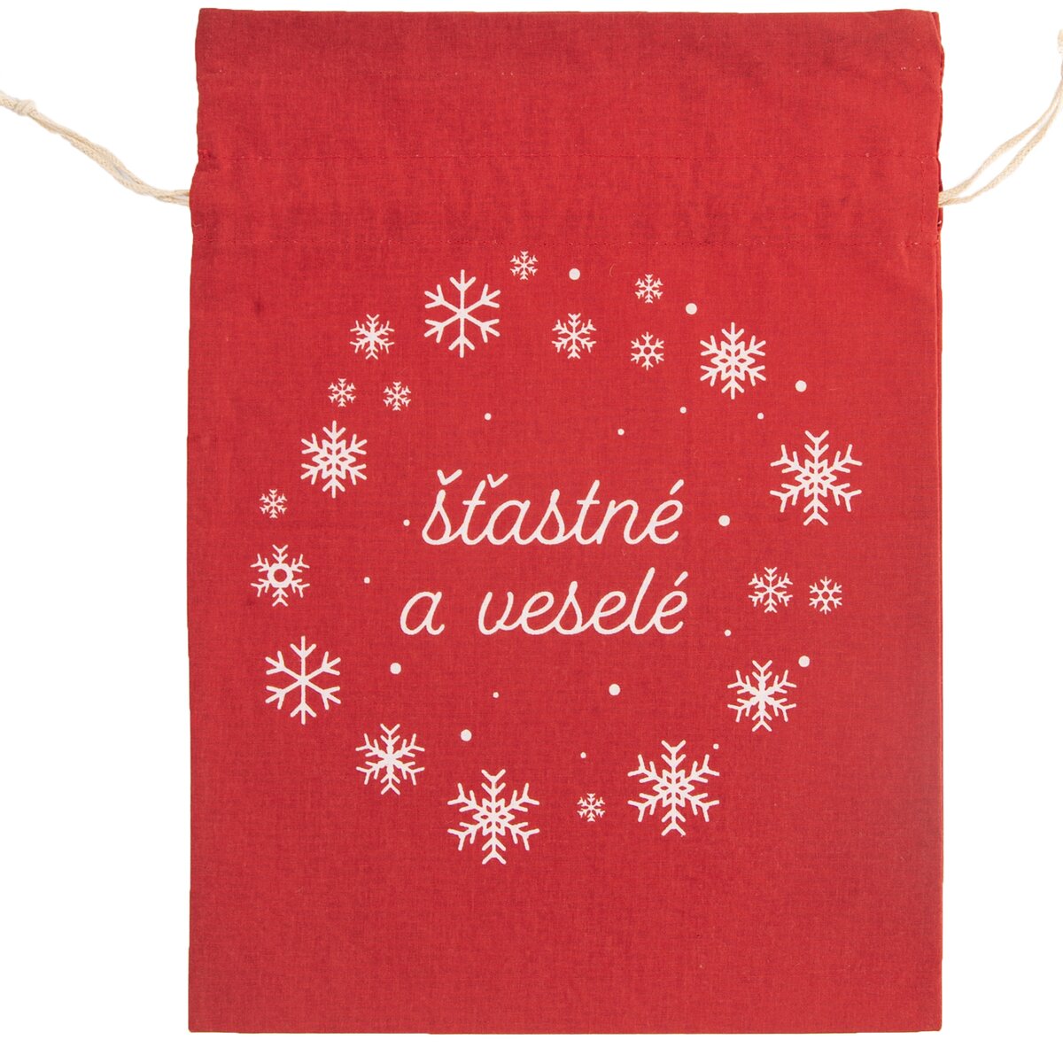 Väčšie červené látkové vrecko s dekorom vločiek a nápisom ŠŤASTNÉ A VESELÉ je určené na uloženie darčekov, napr. originálnych hrnčekov, sviečok, kozmetiky alebo na tzv. mäkké darčeky, ktoré sa zle balia do baliaceho papiera. A na rozdiel od papiera ho možno používať opakovane.