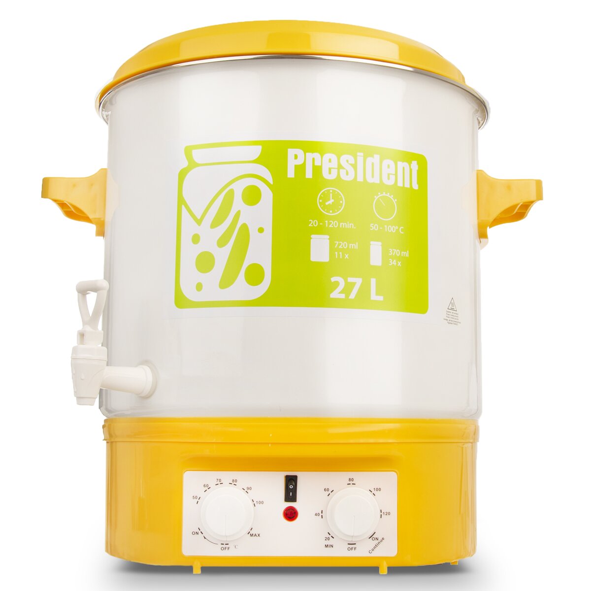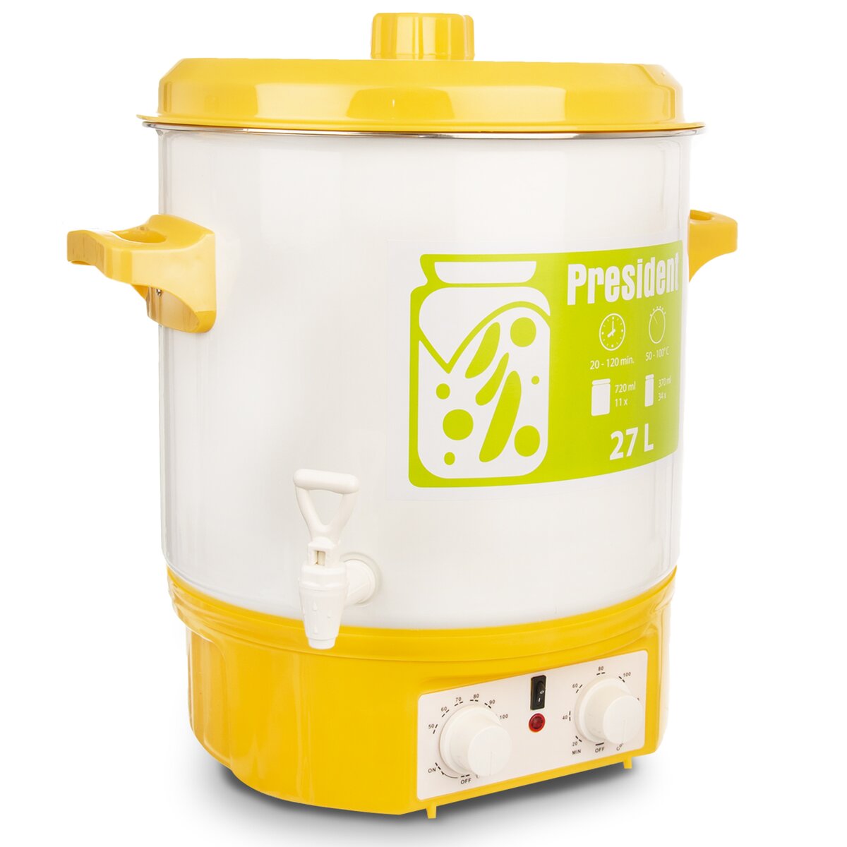 A aby bolo v čom zavárať, prichádzame s praktickým elektrickým zaváracím hrncom z kolekcie PRESIDENT. Tento univerzálny hrniec s objemom 27 litrov má smaltovaný, hygienicky nezávadný povrch a skrytý vyhrievací článok. K uzavretiu slúži praktické plastové veko. Vďaka jeho veľkosti sa do neho zmestí väčšie množstvo pohárov, napr. 11 pohárov 0,75 l alebo 34 pohárov 0,37 l.