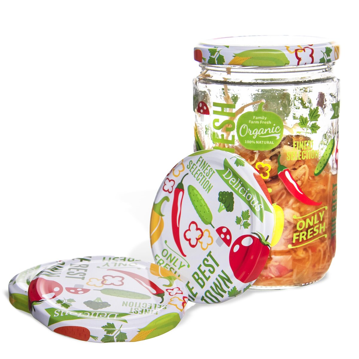 Zavárací pohár so štýlovou potlačou, s objemom 0,66 l. S farebným kovovým viečkom na závit.