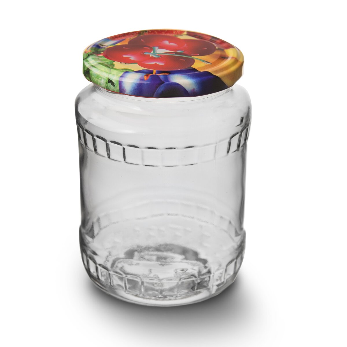 Viac informáciíVäčší zavárací pohár s objemom 0,72 l, s farebným kovovým viečkom na závit, s motívmi ovocia, zeleniny a húb.