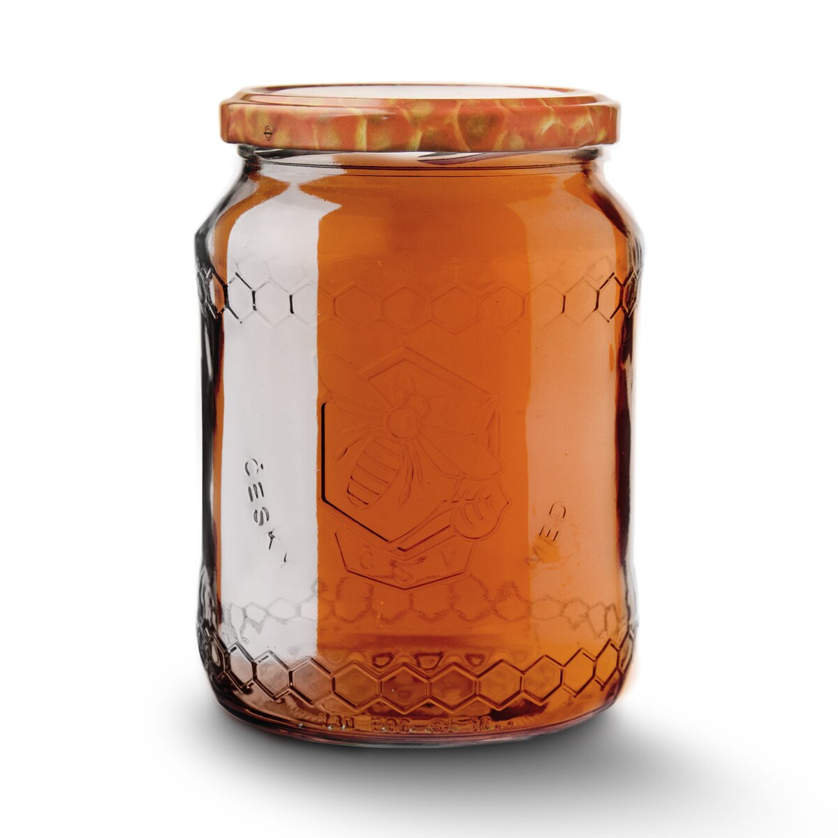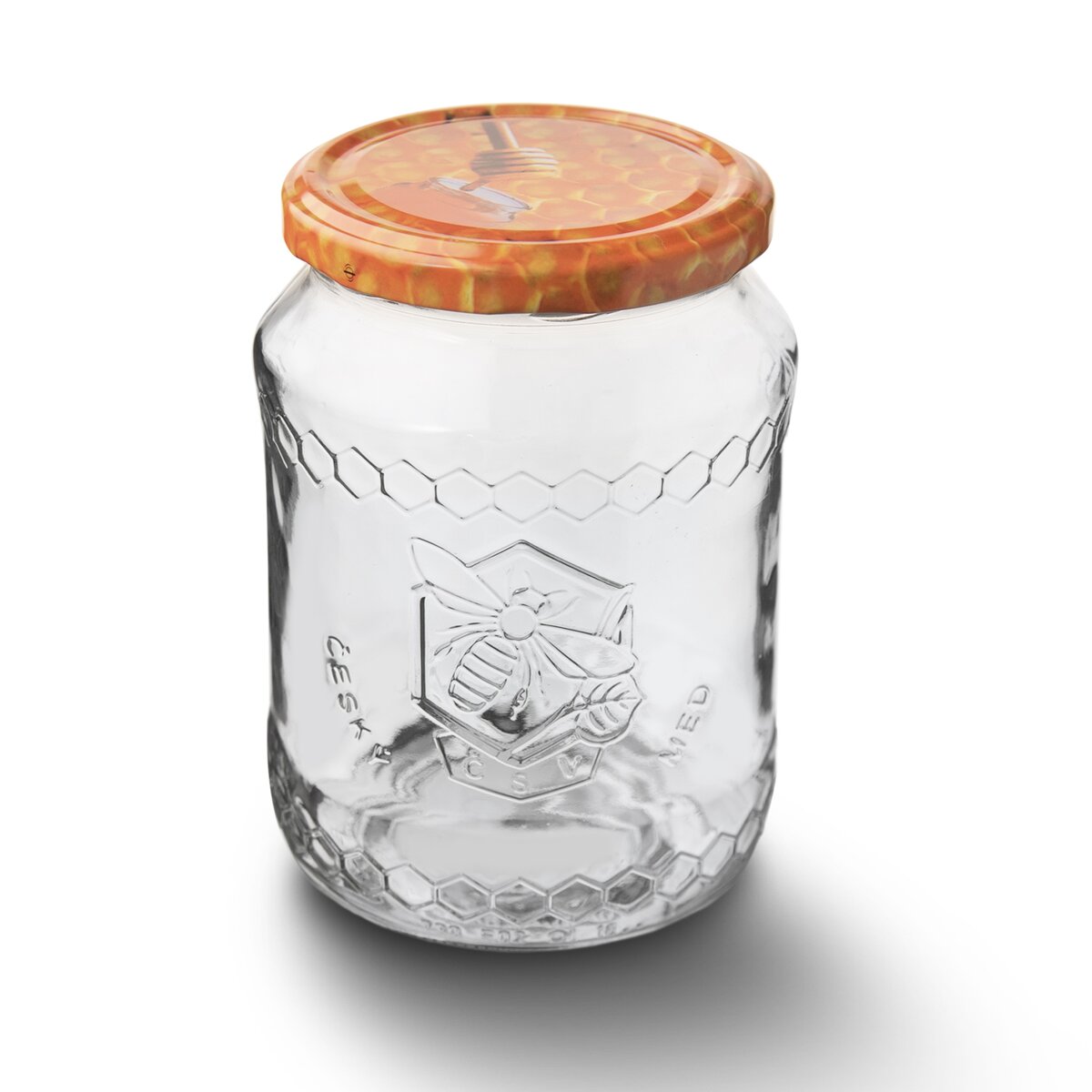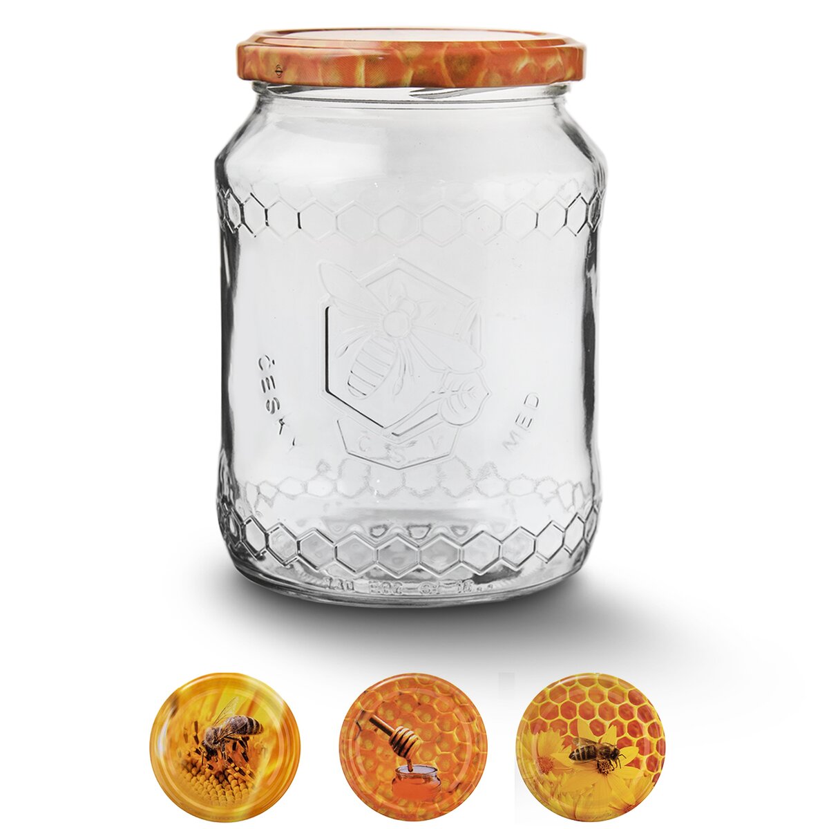 Zavárací pohár so štýlovým reliéfom pre každého vášnivého včelára, s objemom 0,73 l. S farebným kovovým viečkom na závit s motívom včielok a medových plátov.