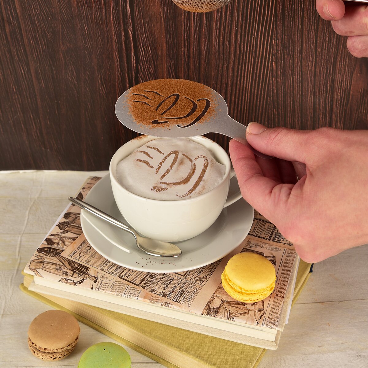 V tejto sade si možno vybrať z motívu zrniek kávy, šálky, štvorlístka, mandaly, srdiečok s linkami a kvety zo srdiečok. Ozdobíte tak jednoducho nielen lahodné cappuccino, ale aj puding, tvarohový dezert, tiramisu alebo smotanový tortu. A ak milujete štýlové servírovanie zmrzliny alebo rôznych tort, posypte dezertný tanier kakaom, práškovým cukrom či cukrárskou prachovou farbou tak, že na ňom vykúzlite pekný motív.