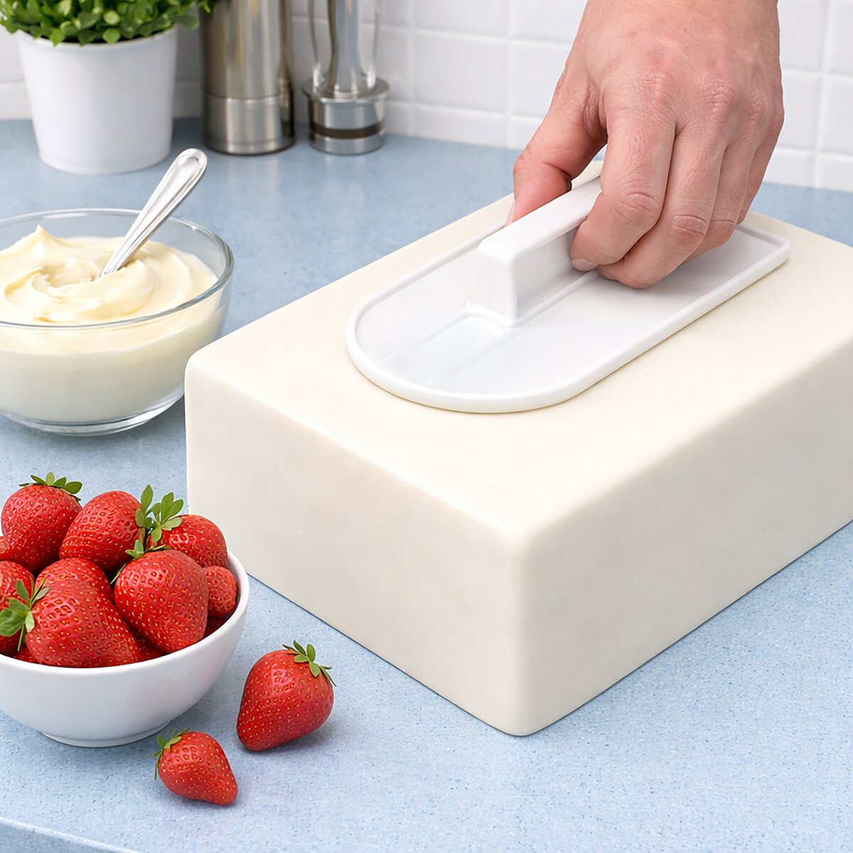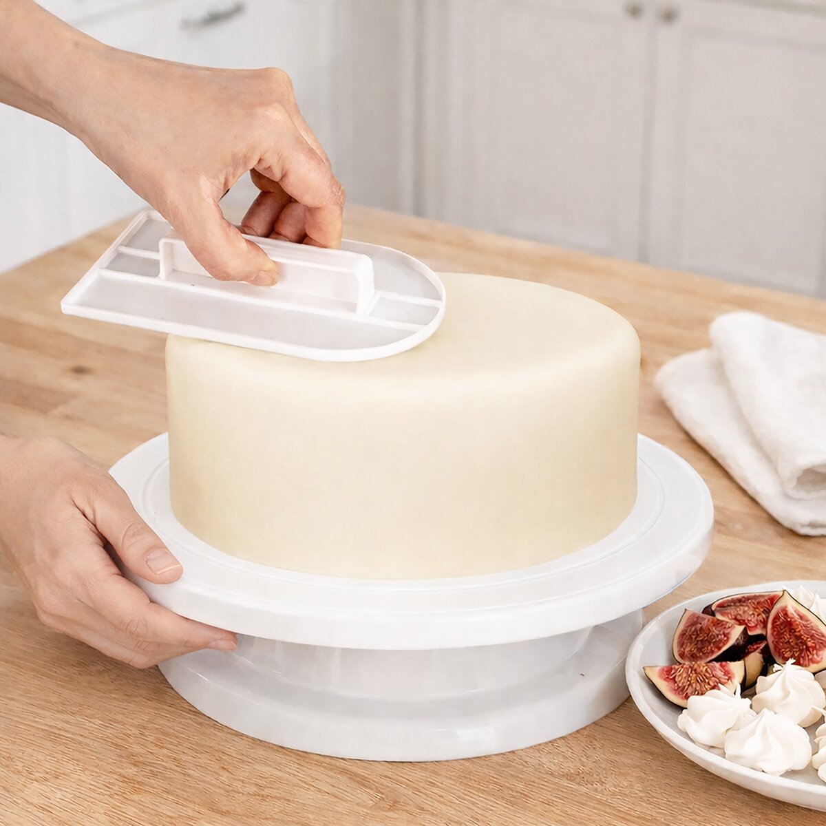 Urobiť nádhernú tortu potiahnutú fondánom či marcipánom nebude problém vďaka hladkej plastovej žehličke. Od stredu k stranám a bokom korpusu vyhladíte hmotu a zbavíte sa prípadných vzduchových bublín. Odporúčame otáčací stojan, bude sa tak lepšie pracovať.