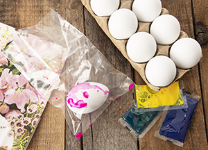 Zvlášť tu by „výdušok“ (ľudovo vyfúknuté vajcia) určite neprežil opakované otváranie a zatváranie dverí. Sada obsahuje 12 plastových vajíčok, tekuté farby a vrecká. V nich vajíčka zafarbíte bez toho, aby boli farby všade okolo.