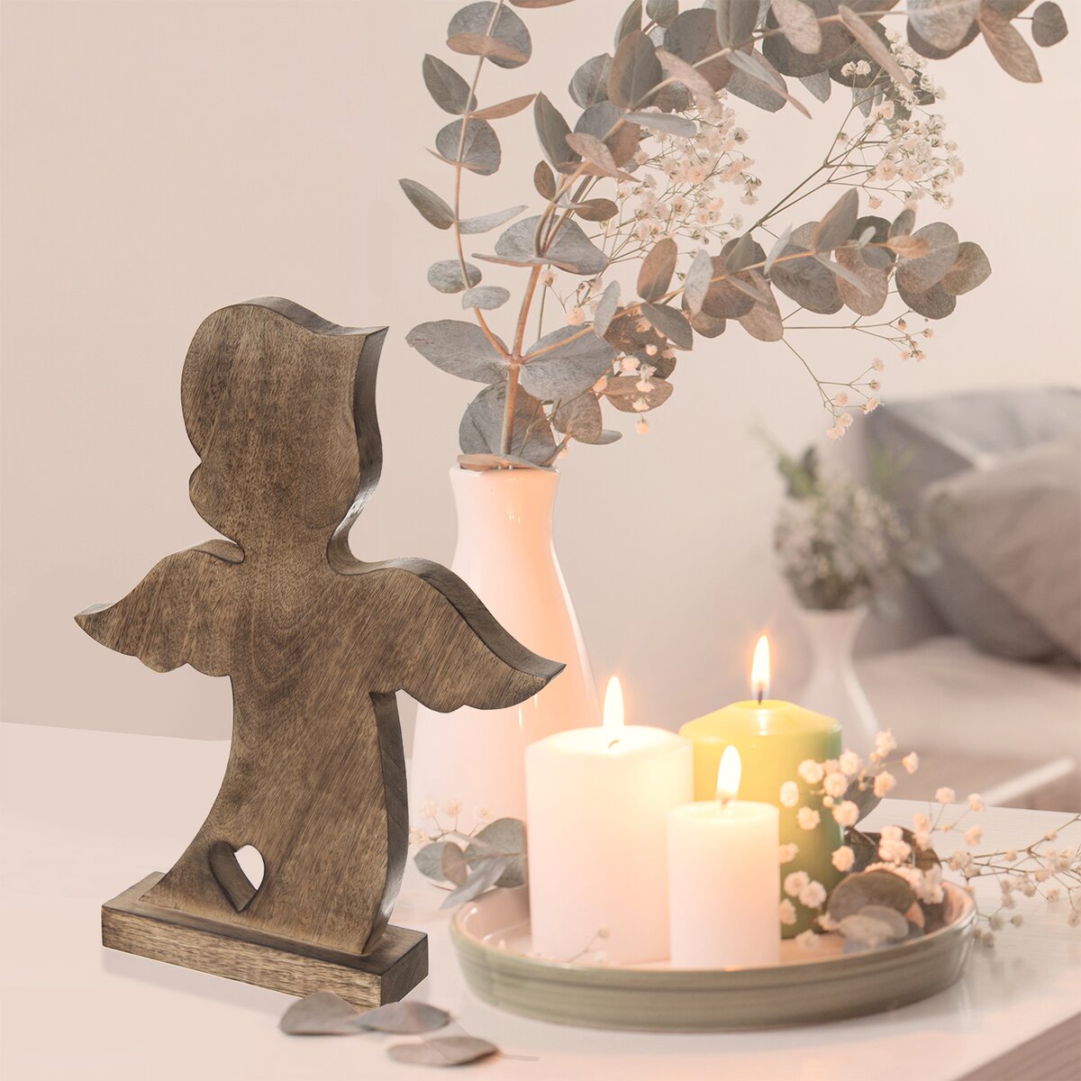 Dekorácia ANJEL s krásnou textúrou mangového dreva a s drobným otvorom v tvare srdca je vhodný ako darček alebo štýlový kúsok do interiéru.