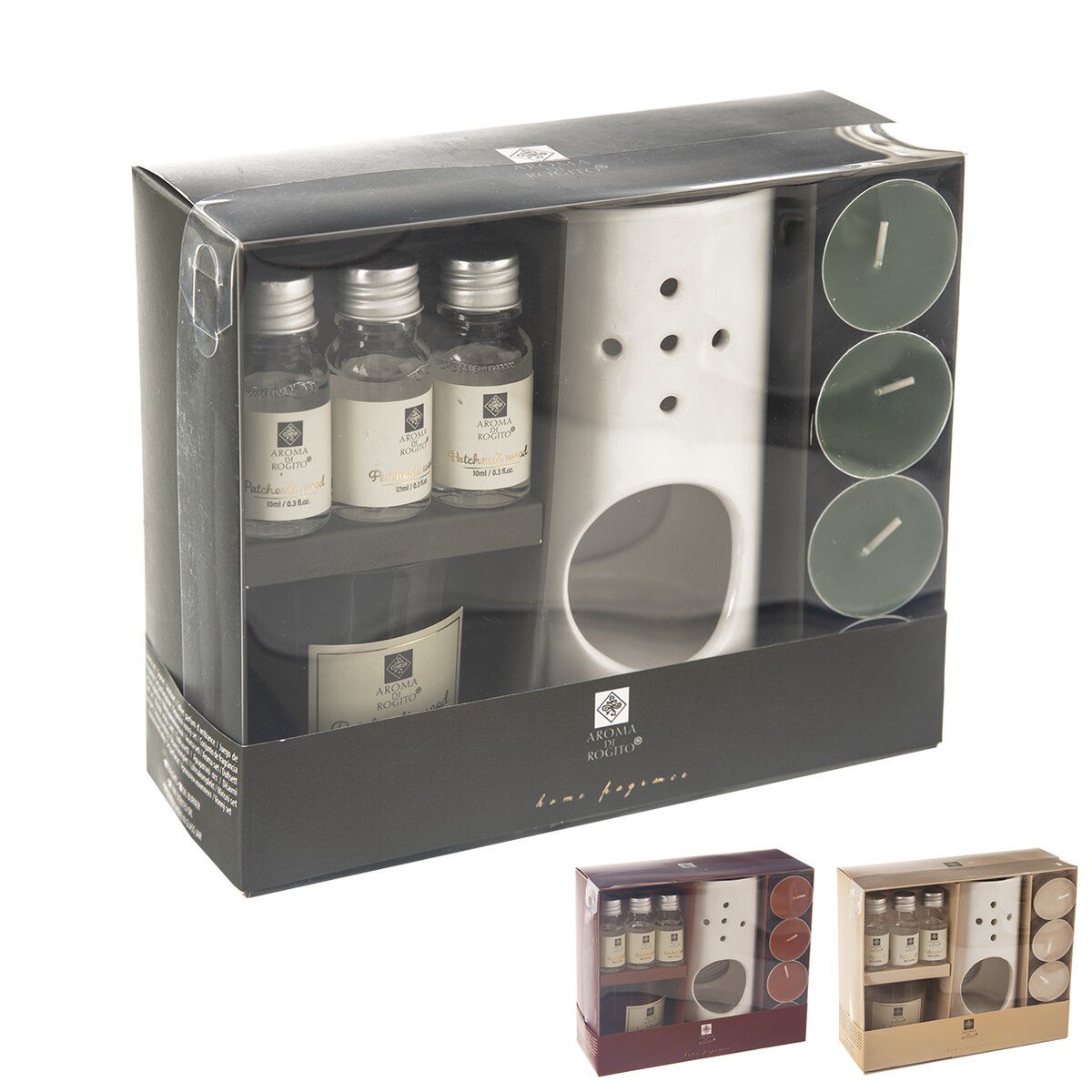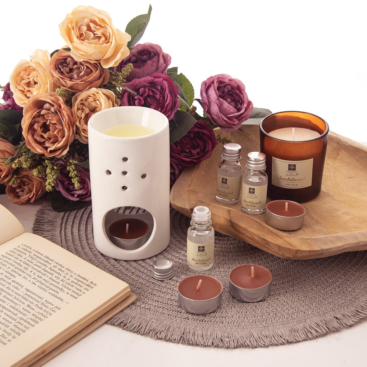 Kód produktu 822257Darčeková sada s keramickou aromalampou, 3 aróma olejmi, 1 vonnou dekoratívnou sviečkou a 4 vonnými čajovými sviečkami do aromalampy. Mix 3 vôní - cédrové drevo, santalové drevo a pačulové drevo.
