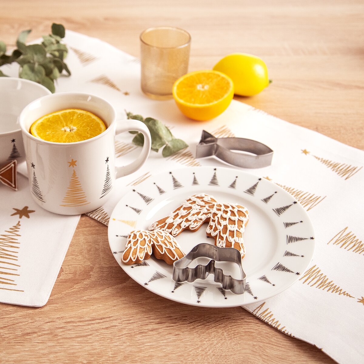 Kód produktu 728045Biely behúň s motívom zlatých stromčekov zo 100% bavlny ozdobí sviatočný stôl v kuchyni, jedálni aj obývacej izbe.