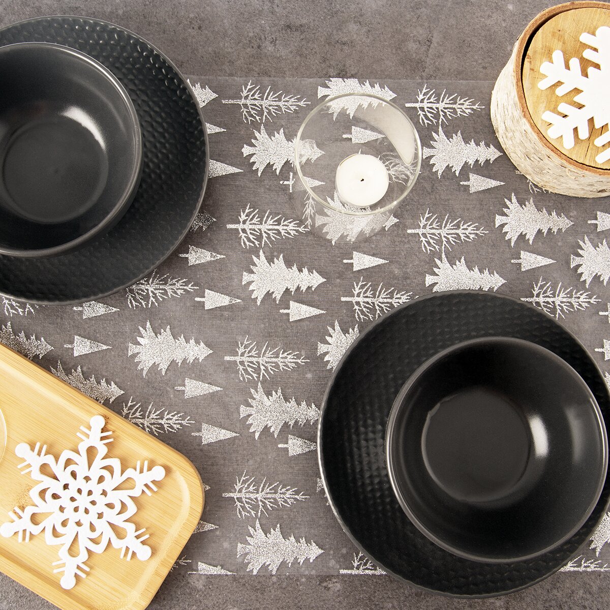 Viac informáciíSlávnostnú náladu vytvorí okrem krásneho jedálenského servisu aj zaujímavý priehľadný behúň s motívom strieborných stromčekov. Vynikne na tmavšom jednofarebnom obruse alebo ho položte priamo na dosku stola. Vykúzlite si tak okamžite slávnostnú sviatočnú atmosféru. Navyše ho môžete odstrihnúť nožnicami a vytvoriť si tak aj dekoratívne prestieranie alebo podložky.
