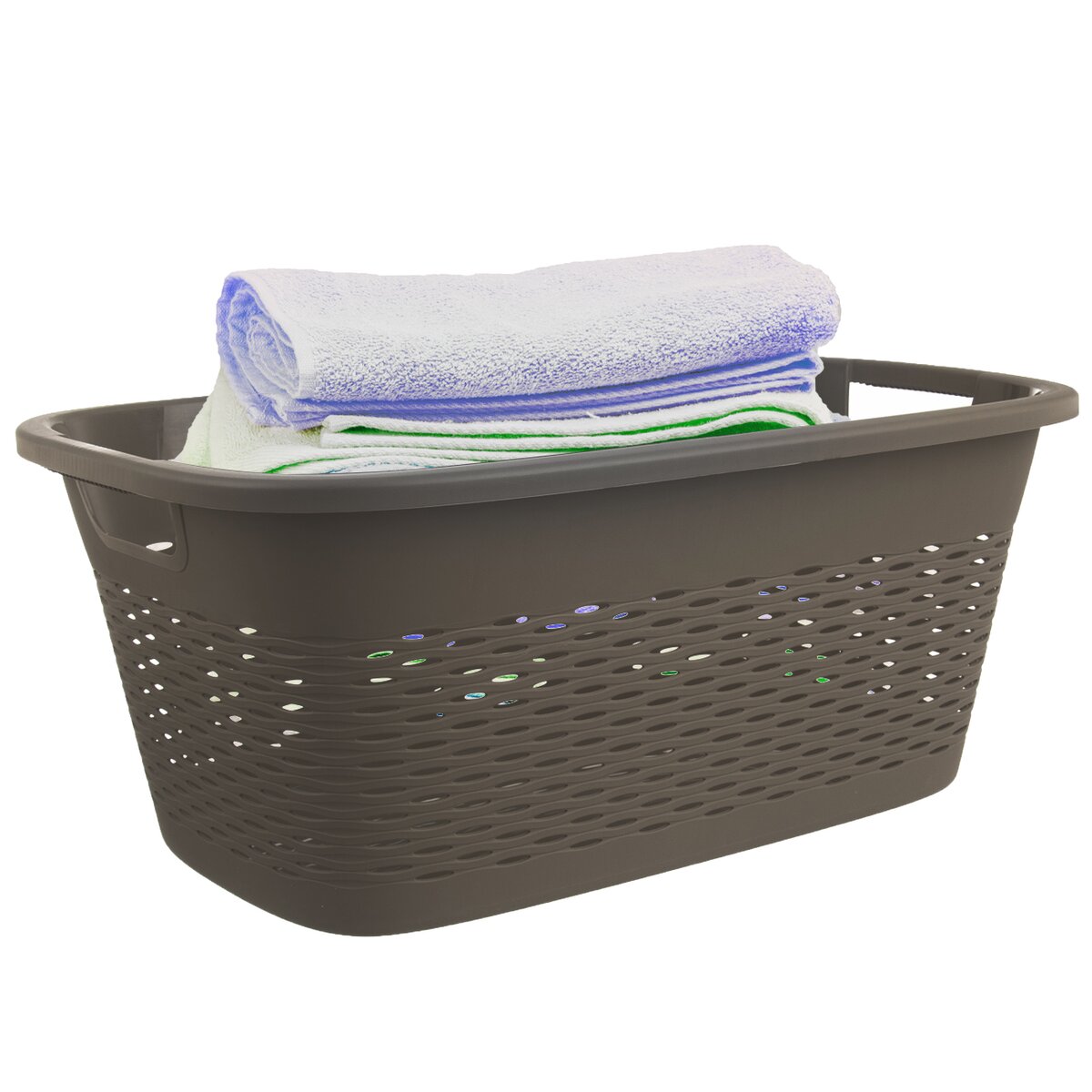 Kód produktu 730550Tmavo šedý plastový kôš LOOP s dvoma uchami a dierovaným povrchom, vo veľkosti 58x37,5x24 cm, je vhodný na prenášanie čistej vypranej bielizne a najrôznejších drobností v domácnosti.