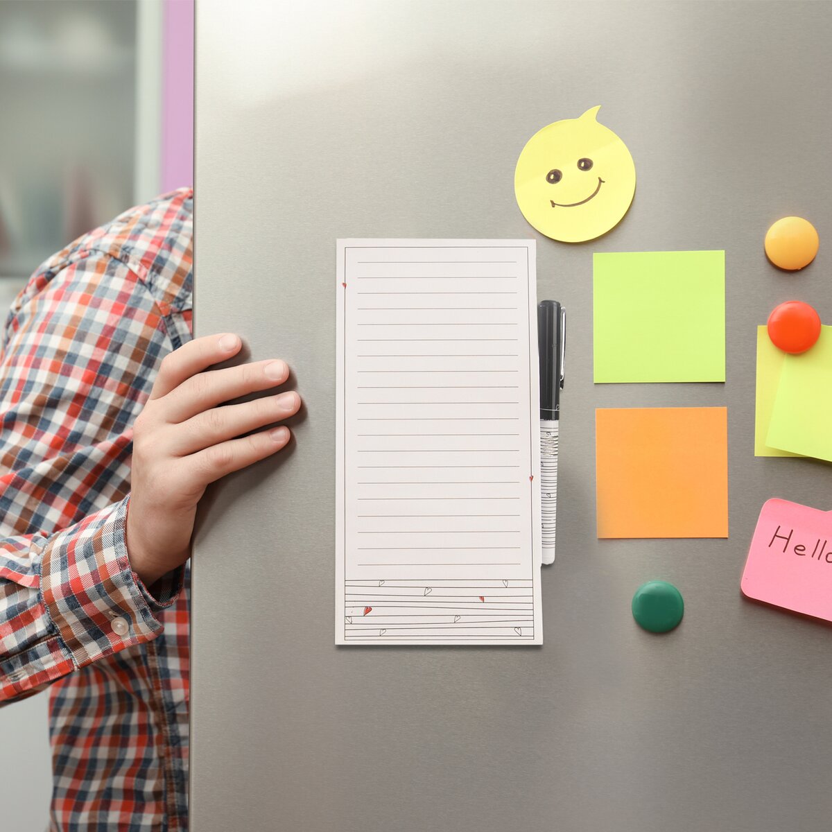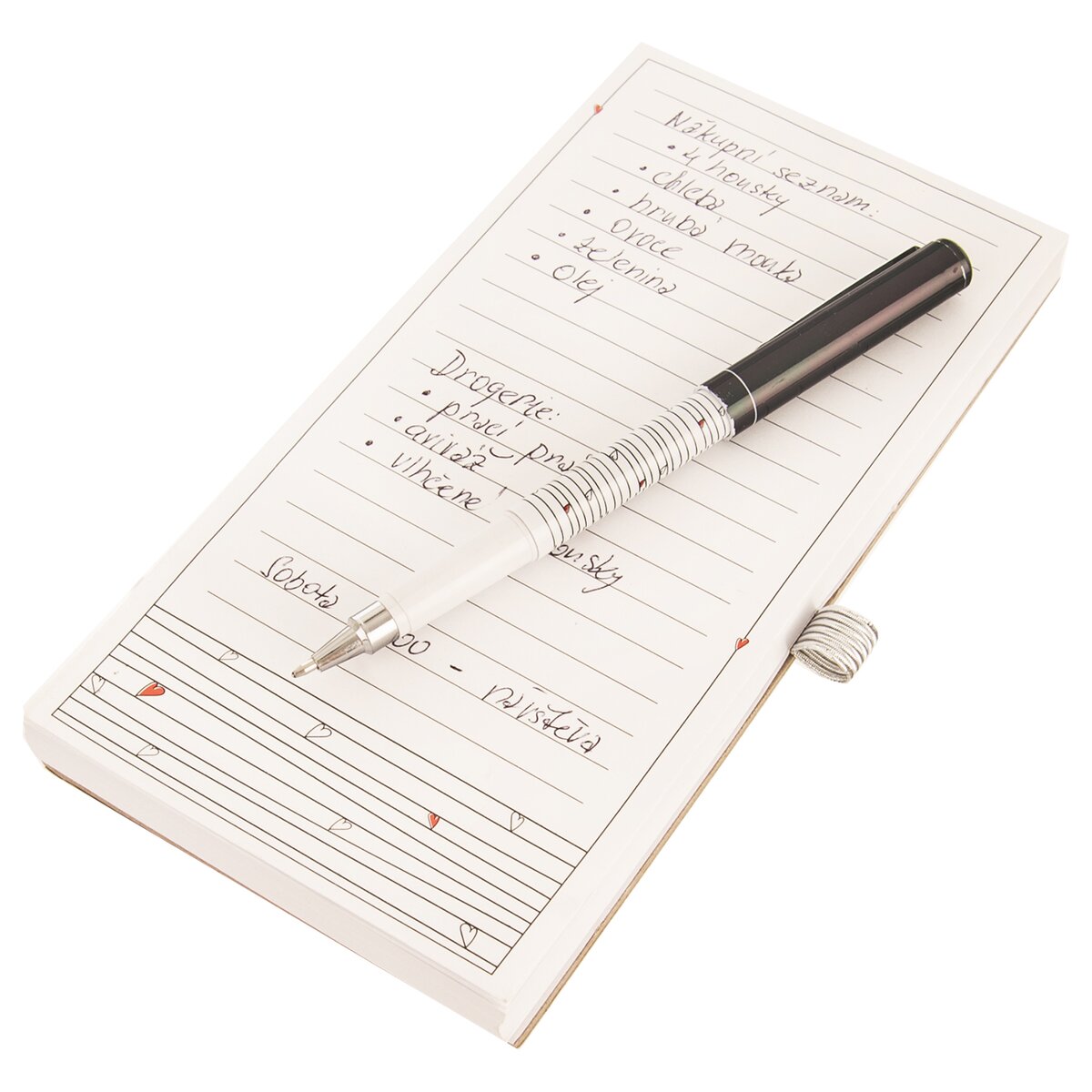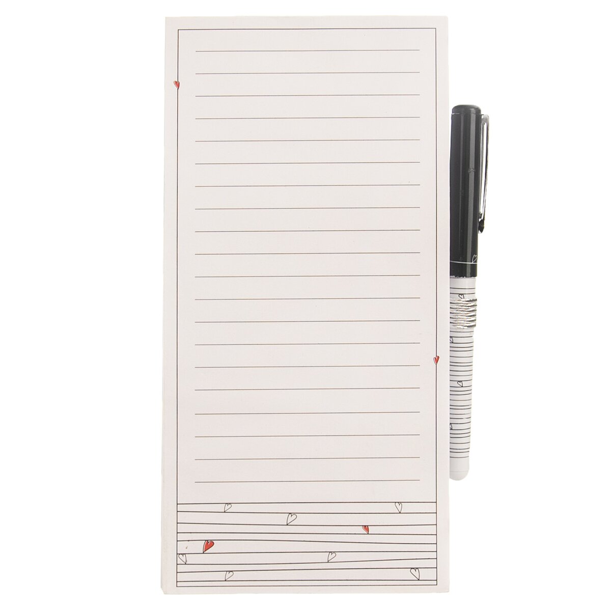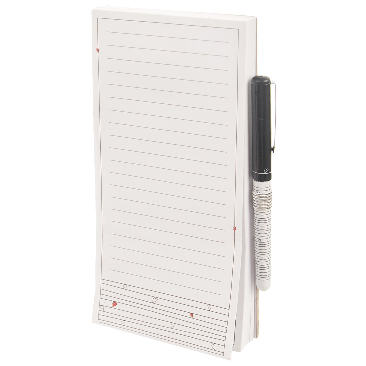 Kód produktu 741182Poznámkový linajkový blok s drobnými srdiečkami a perom môžete mať v kuchyni pohodlne pri ruke, ak využijete magnetku na jeho zadnej strane a pripevníte ho na chladničku alebo inú kovovú plochu. Využijete ho na súpis nákupu aj pre úlohy alebo odkazy.