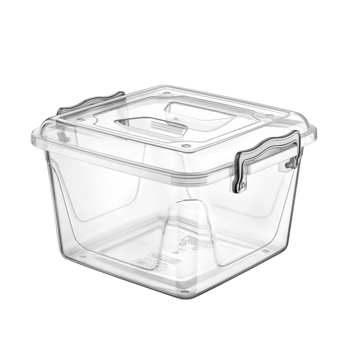 Kód produktu 122618Nízky priehľadný úložný box s objemom 6 l s viečkom na dva pevné klipy. Je z pevného plastu a má tvar štvorca.