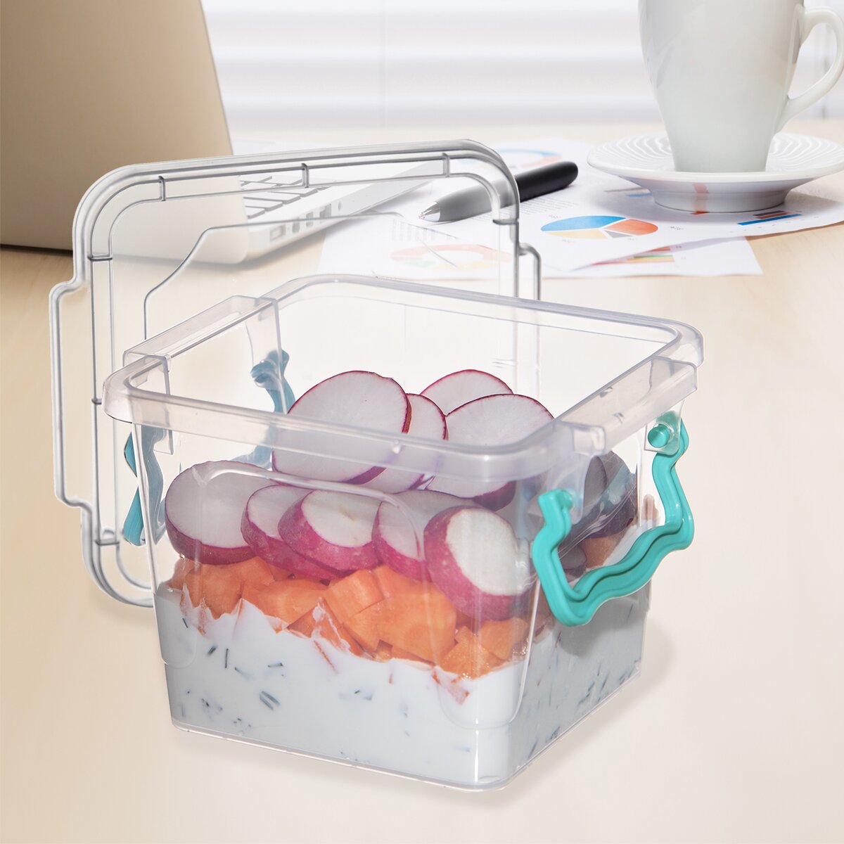 Vďaka tomu, že je transparentný, ihneď spoznáte, čo je vo vnútri. Dva postranné klipy zaručia pevné uzavretie boxu a dlhšiu trvanlivosť uložených potravín. Môže poslúžiť aj ako úložný box na menšie predmety, či už do kúpeľne, spálne alebo pracovne.