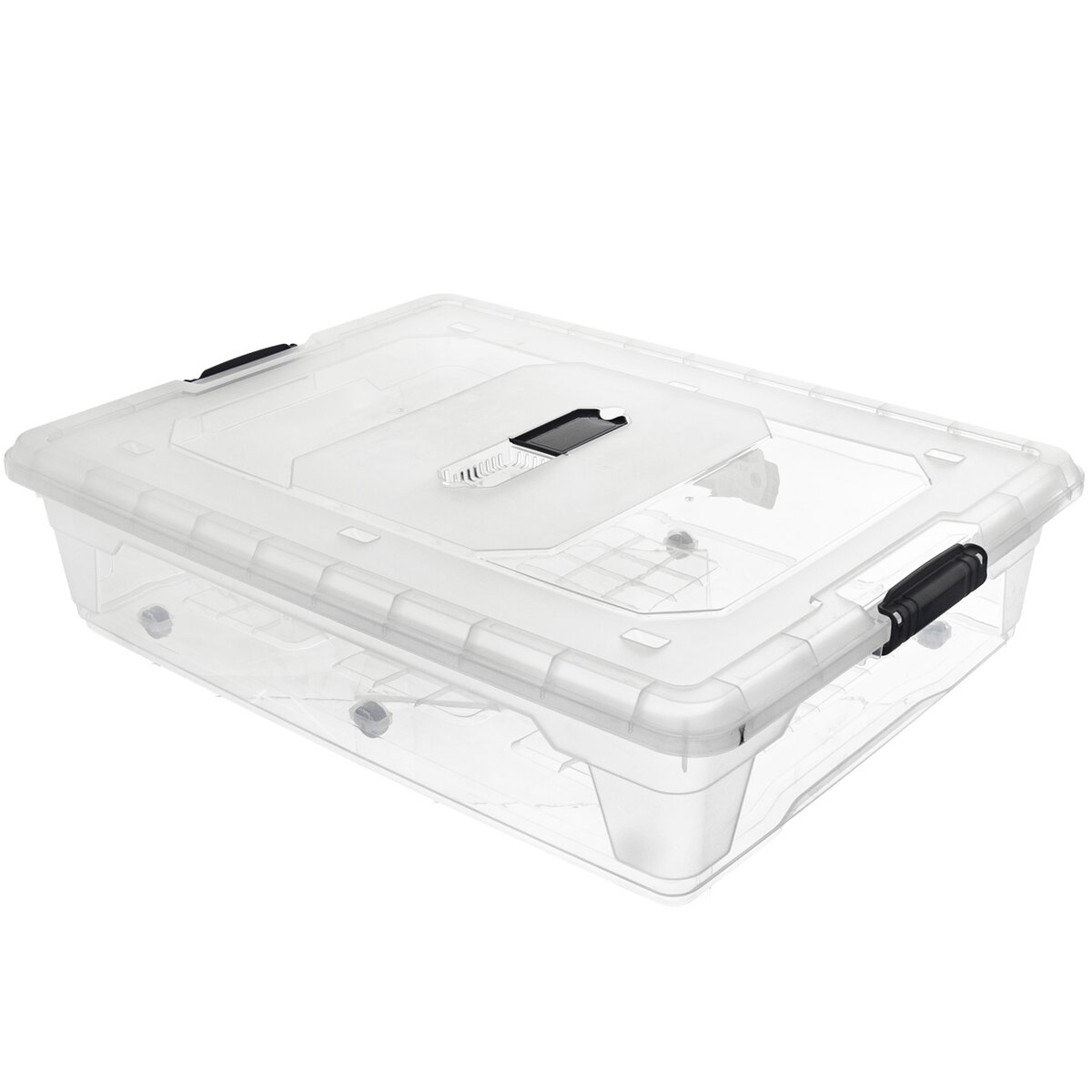 Kód produktu 154009Nízky priehľadný úložný box s objemom 55 l s viečkom na dva pevné klipy a odvetrávacím ventilom. Je vyrobený z pevného plastu a má 6 praktických koliesok.