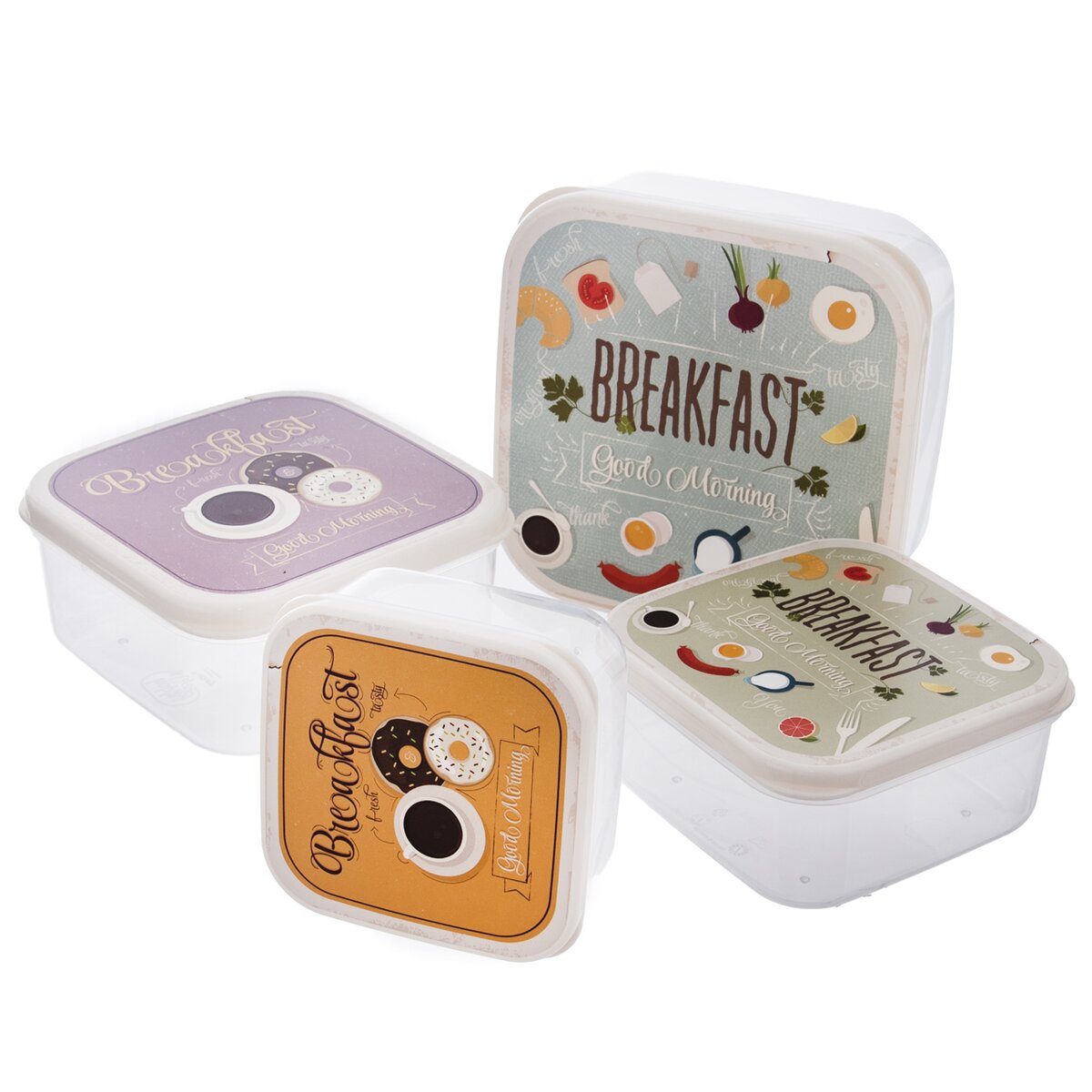 Kód produktu 154014Sada štyroch desiatových boxov s farebným dekórom BREAKFAST. Majú objem 0,3 l, 0,45 l, 0,65 l a 1 l.