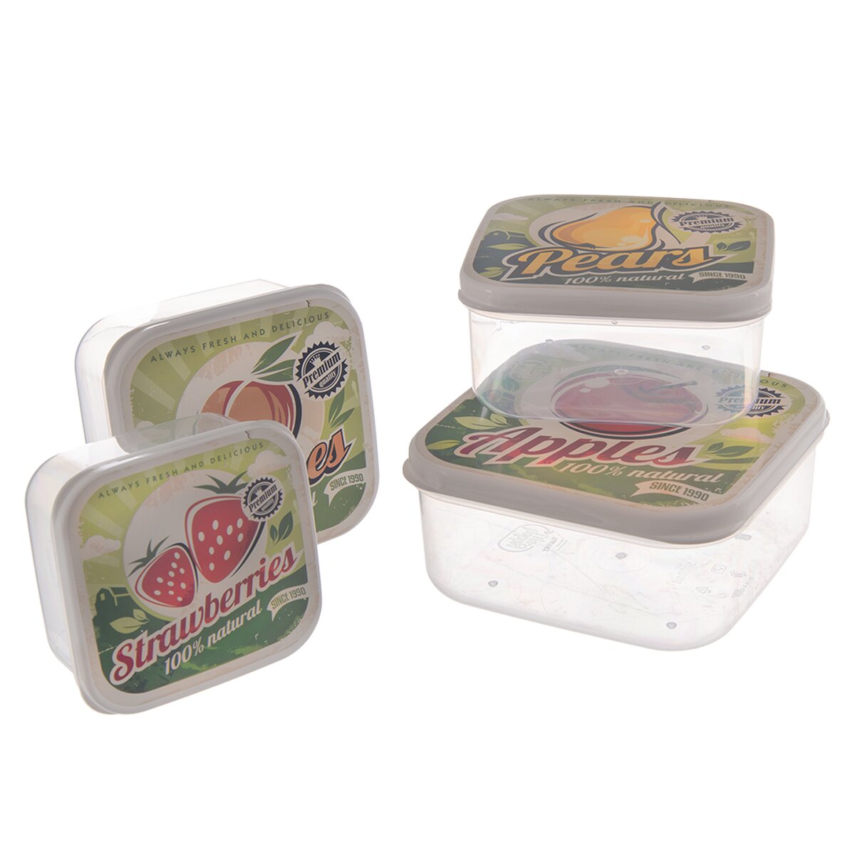 Kód produktu 154057Sada štyroch plastových desiatových boxov v štýlovom retro dekore ovocia. Majú objemy 0,3 l, 0,45 l, 0,65 l a 1 l.