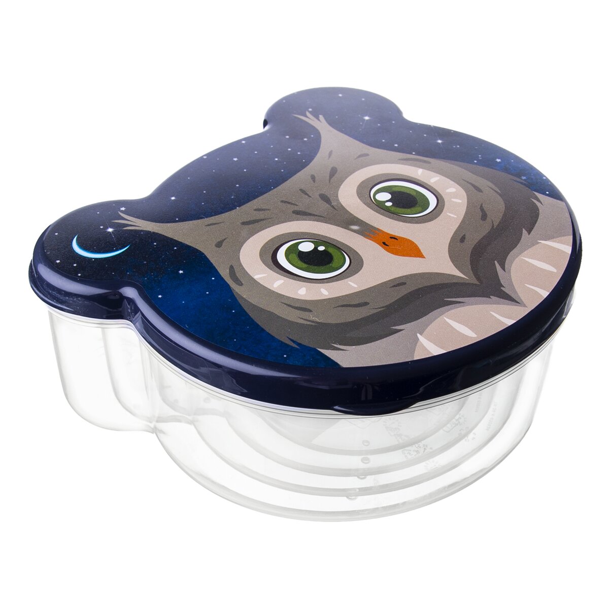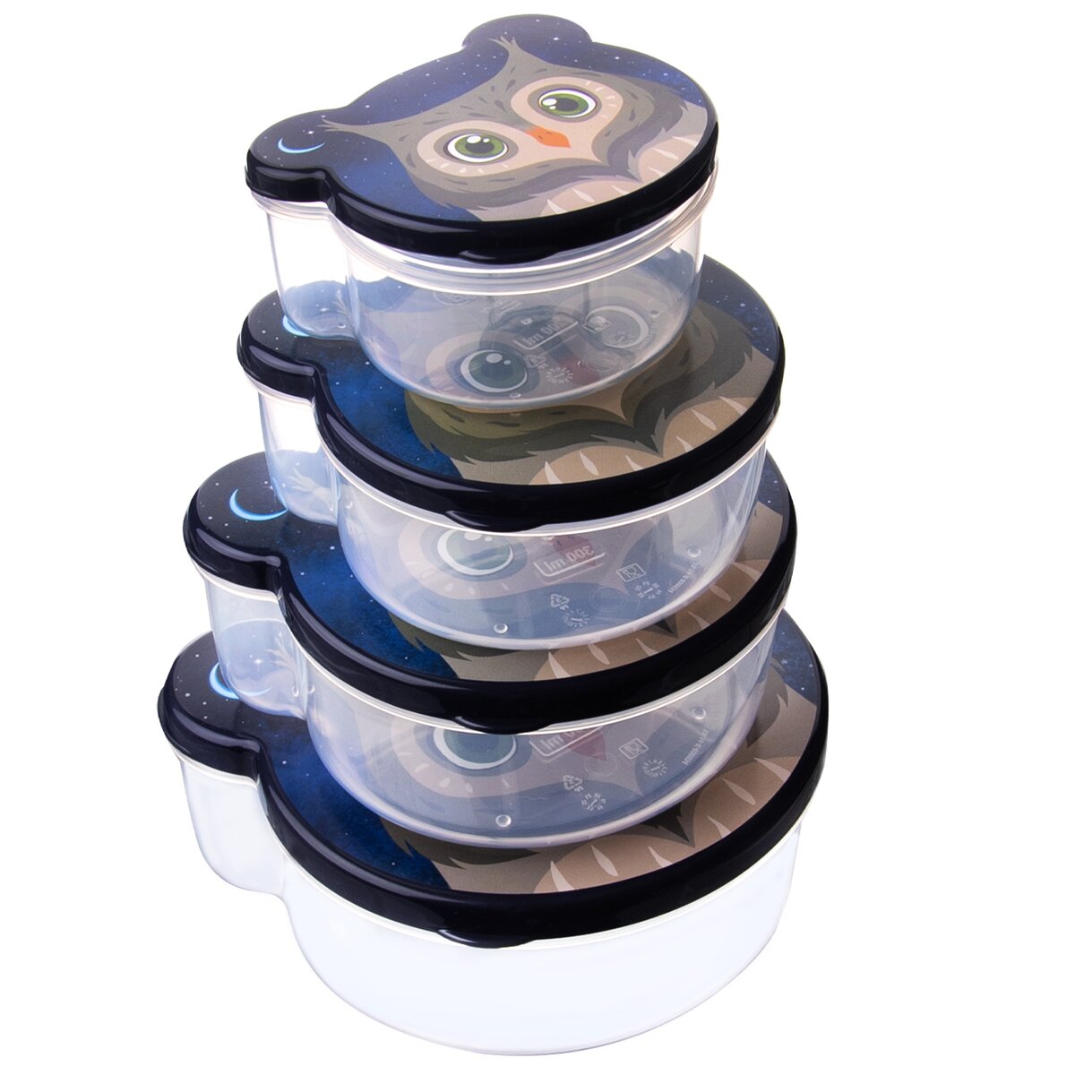 Kód produktu 154012Sada štyroch plastových desiatových boxov s viečkom v tvare SOVA. Majú objemy 0,2 l, 0,3 l, 0,5 l a 0,75 l.