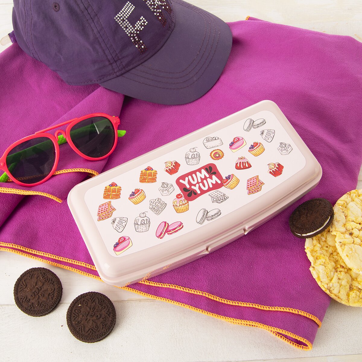 Kód produktu 154043Plastový dlhší box veľkosti 20,5 x10x5, 5 cm, vhodný na uloženie desiaty do školy, na výlet aj dovolenku. Viečko s dekorom tort, ktoré uzavrie box na klip.