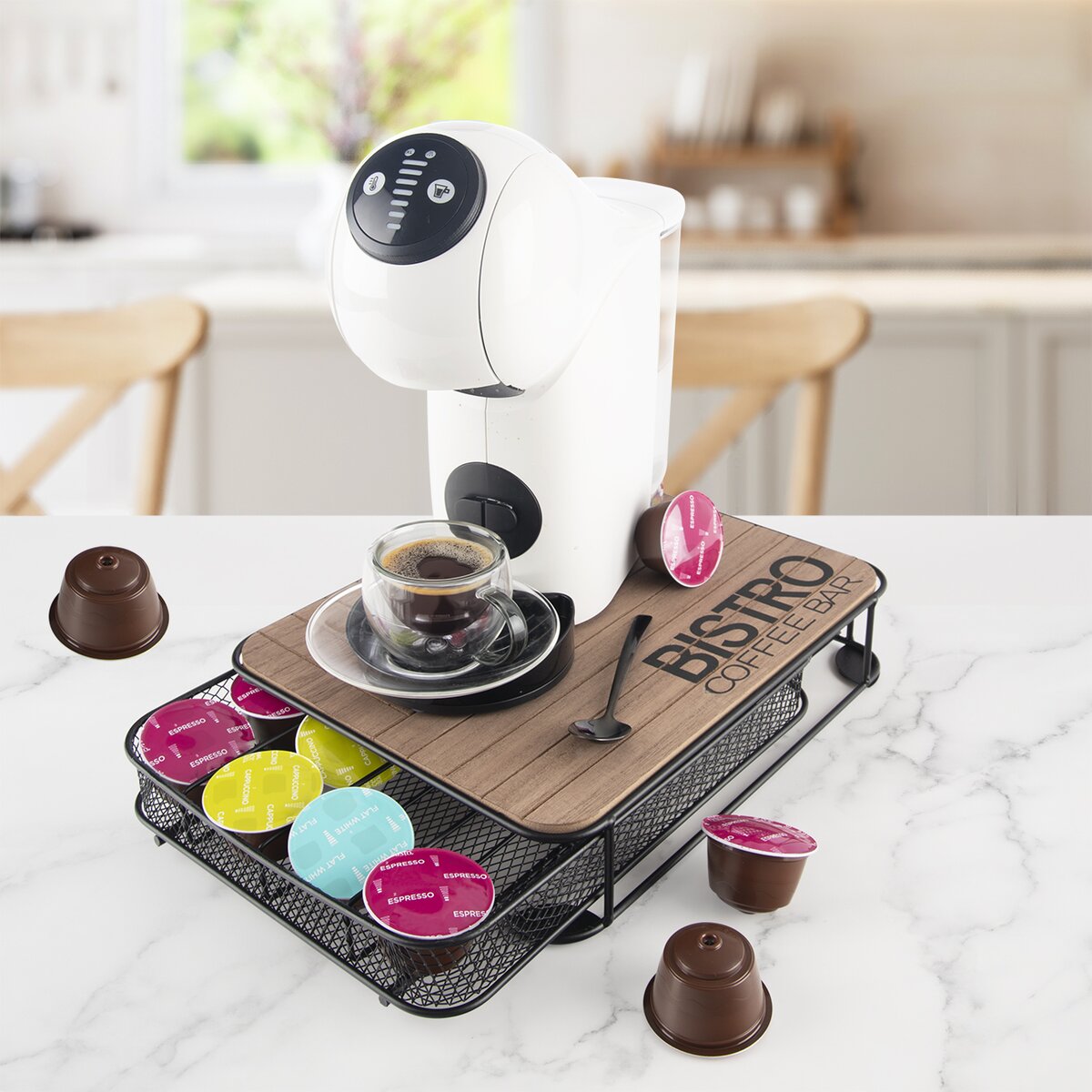 Viac informáciíPokiaľ ste milovníkom kávy a máte doma kávovar na kapsule, určite oceníte praktický box z kolekcie BISTRO. Kávovar naň môžete postaviť a do spodnej drôtenej časti usporiadať jednotlivé druhy kapsúl. Obľúbené kapsule na espresso, cappuccino alebo caffé latté budú vždy po ruke, pekne schované a pritom stačí vnútornú zásuvku vytiahnuť a vybrať si kapsulu podľa chuti.
