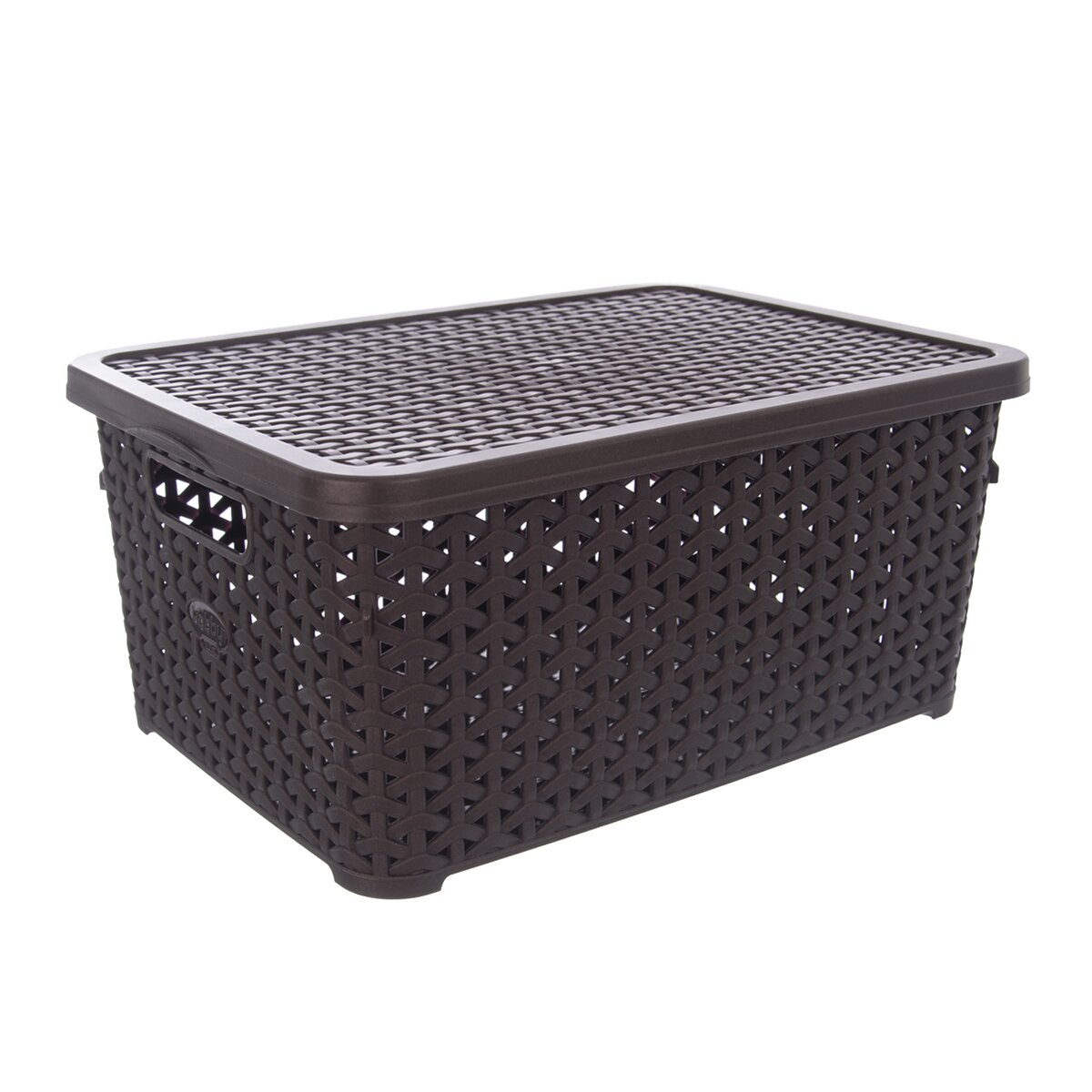 Kód produktu 730296Box s uchami a vekom s dekórom ratanu. Materiál: plast. Farebný assort - biela hnedá, béžová. Rozmey: objem cca 6 l, 29x19,5x12,5 cm.