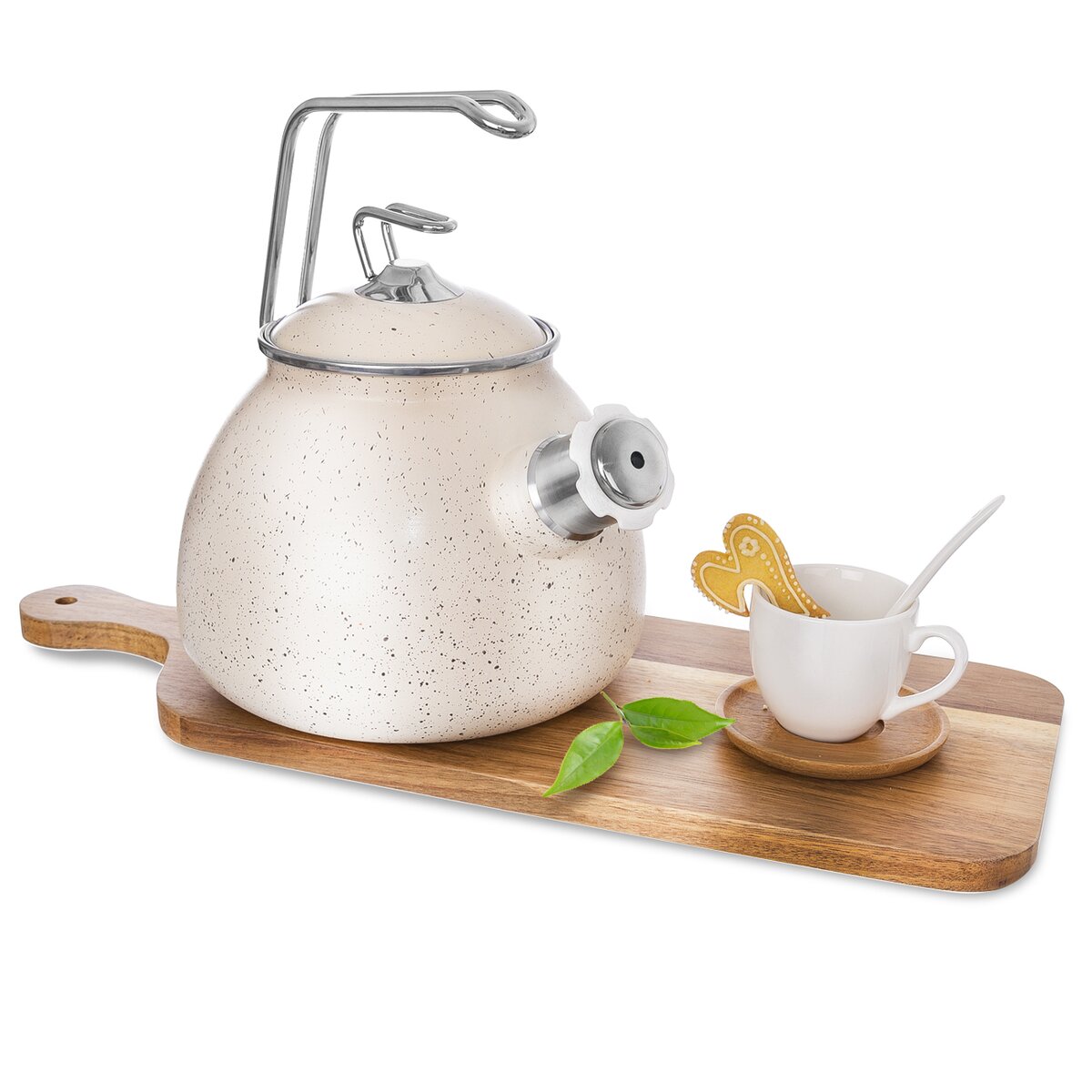 Čajník smalt s píšťalkou a s pokrievkou, ktorá Vám ohlási variacu sa vodu. Materiál: uhlíková oceľ, smalt, plast, chróm. Rozmery: objem užitný 2,3 l, celkový 3,7 l, pr. 19 cm, v. 23 cm. Vhodný do umývačky na riad. Je vhodný na všetky typy spotrebičov vrátane indukcie. Smaltovaný riad je zdravý a hygienický: smalt chráni potraviny proti prenikaniu škodlivých kovových iónov a na hladkom povrchu sa nemnožia baktérie. Je krásny: kombinácie farieb a obrázkov sú skoro nekonečné. Je praktický: ľahko sa čistí, je odolný proti mechanickému poškodeniu.