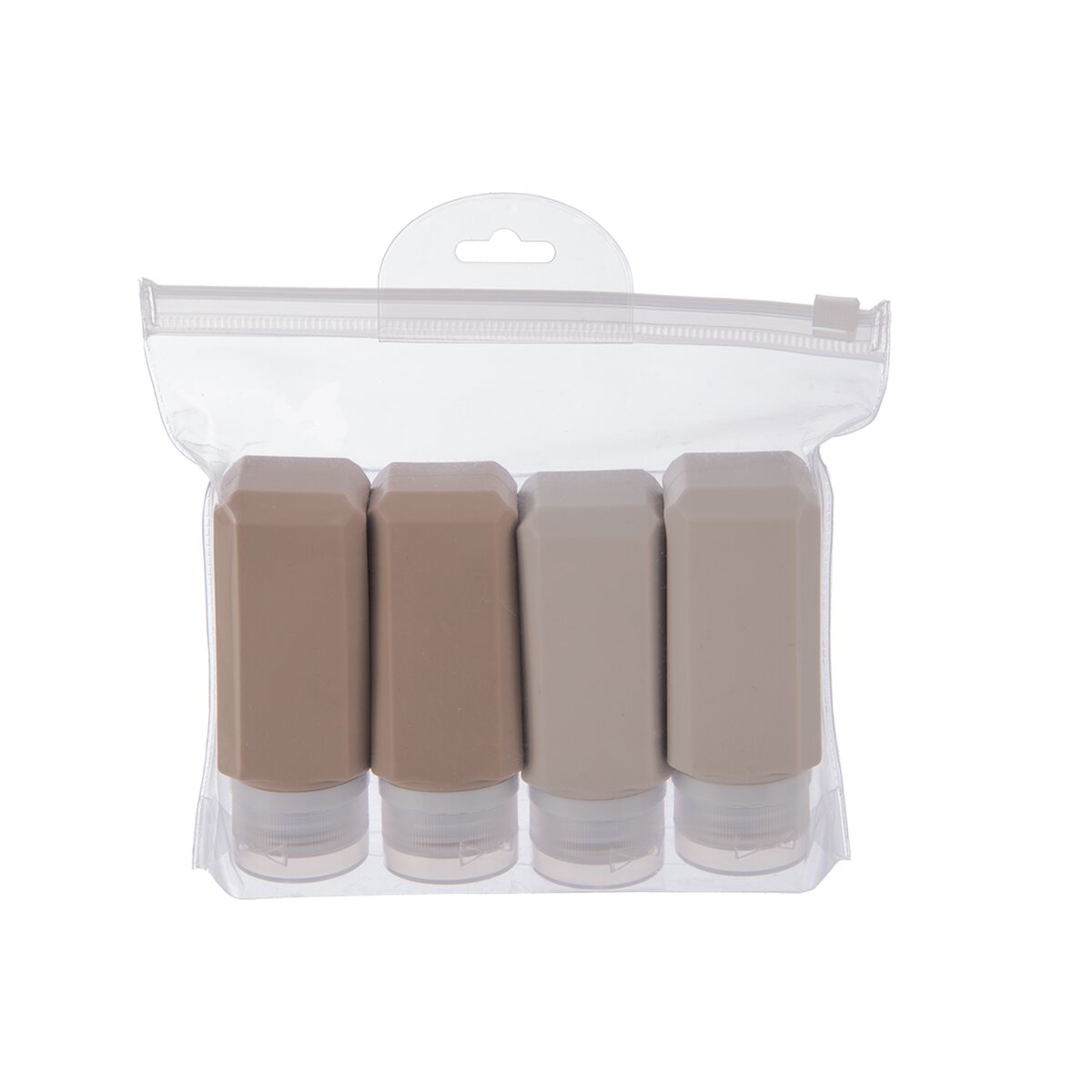 Kód produktu 851325Praktická sada 4 kusov silikónových fľaštičiek s plastovým odklápacím viečkom je určená na uloženie umývacích gélov, šampónov, krémov, tekutého mydla a pod., určených na cestovanie. Majú objem 90 ml a sú uložené v uzatvárateľnom priehľadnom puzdre.