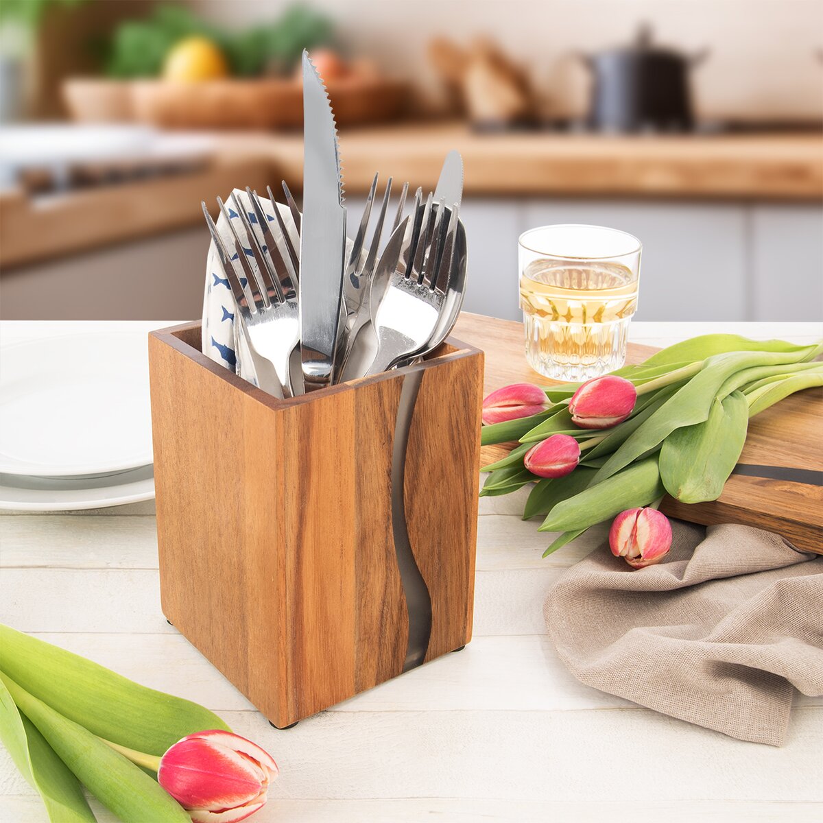 Hoci sa jedná o štýlové doplnky, sú veľmi funkčné a trvanlivé. Jedinečná kolekcia RIVER spája nádherné akáciové drevo so špecifickou, výraznou kresbou a modernou živicou (resín). Tá sa vinie, rozlieva ako priehľadná rieka v jemnom šedom odtieni. Kresba dreva je unikátna, každý kúsok preto tvorí originál.