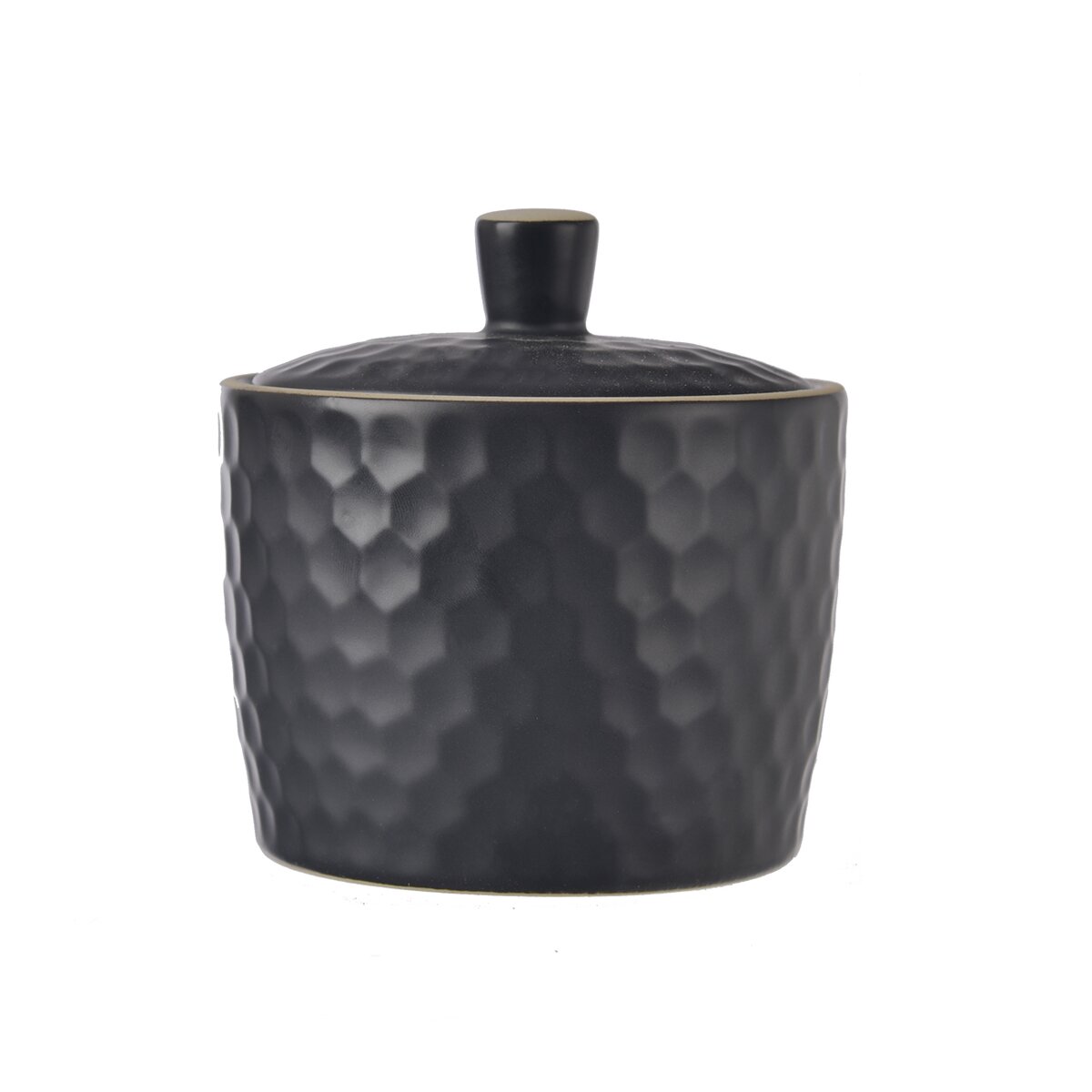 Kód produktu 155404Matná čierna cukornička s viečkom má štýlový plastický dekor a svetlú obvodovú linku. Hodí sa na podávanie kryštálového alebo kockového cukru.