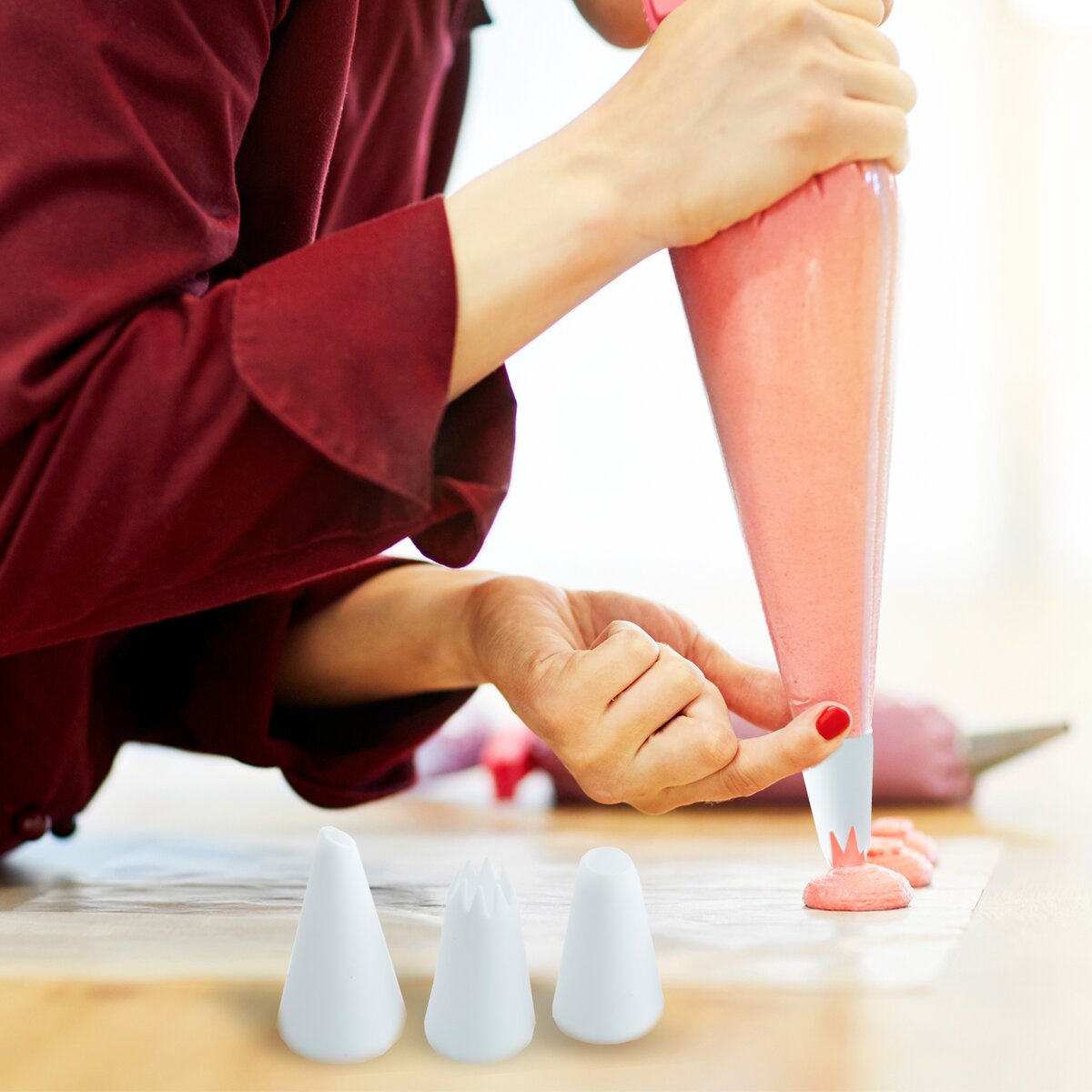 Vrecká dĺžky 35 cm sú vyrobené z plastu PP, takže nedôjde k presakovaniu náplňou. Naviac je možné ich použiť samostatne, so zastrihnutím špičky na zdobenie perníkov cukrovou polevou, alebo ich zastrihnúť podľa priemeru pridaných špičiek.