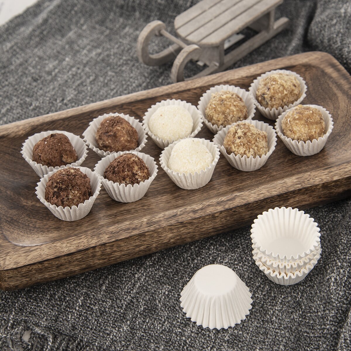 Cukrárske košíčky z papiera na pečenie, ktore znesú teplotu až 220 °C, pre všetkých domácich cukrárov a pekárov. Možno do nich vložiť nepečené sladké guľôčky, naliať čokoládu s orechmi, ovocím či božským slaným karamelom.