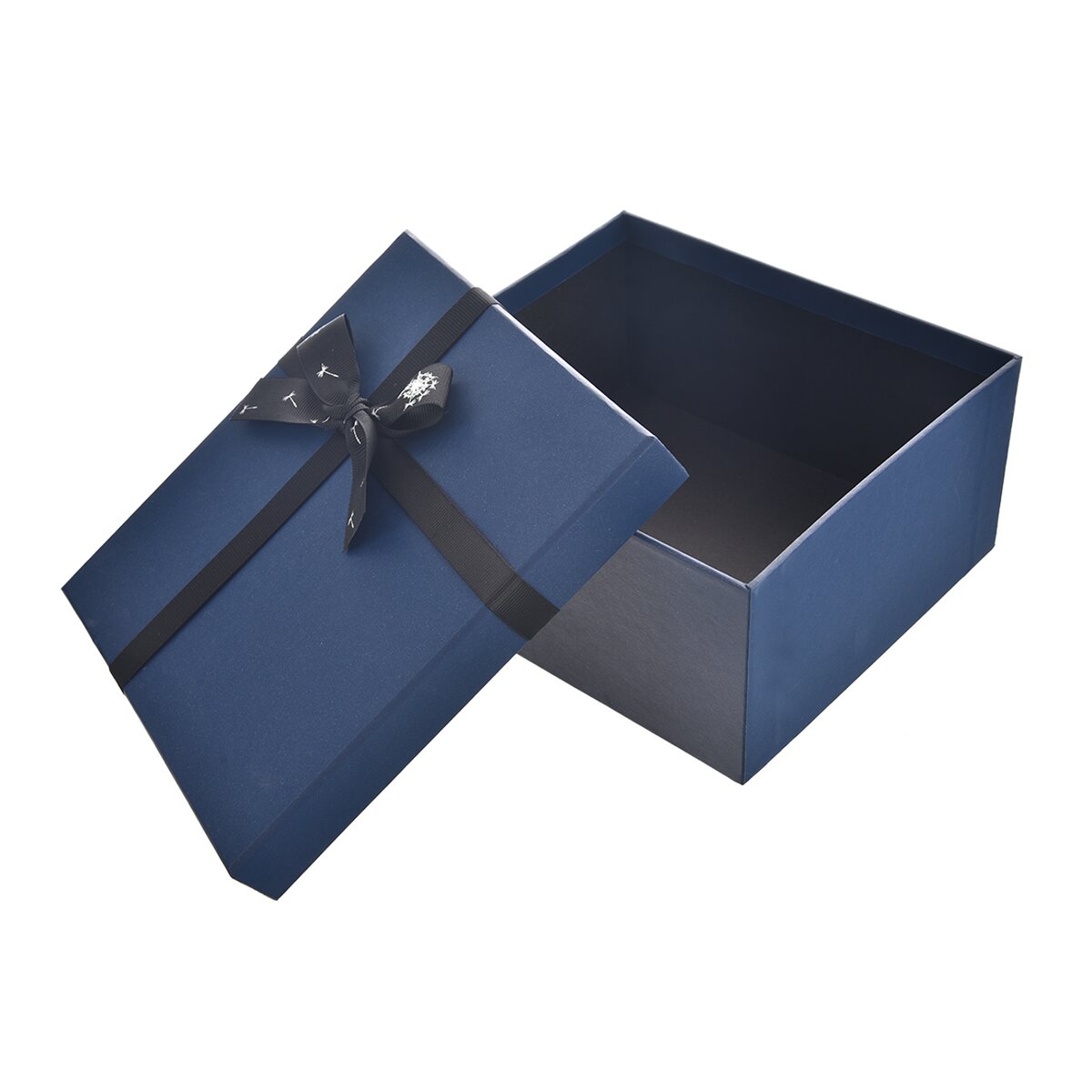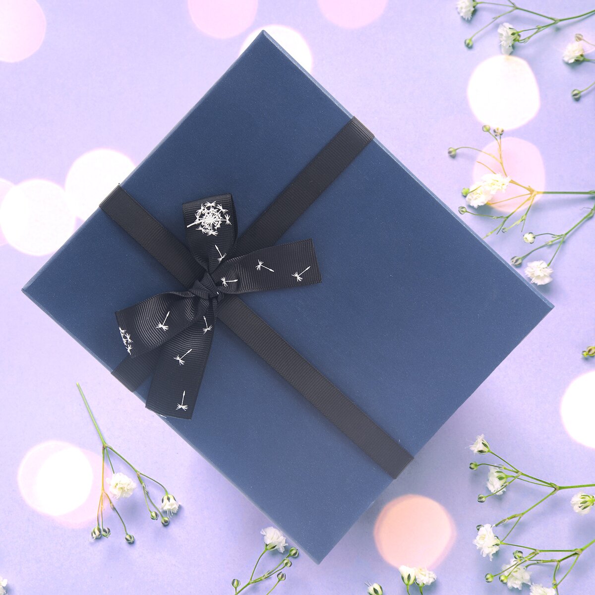 Kód produktu 822737Matná modrá krabica z kraftového papiera má na veku elegantnú čiernu stuhu, zdobenú motívom páperia z púpav. Určená na pohodlné balenie darčekov.