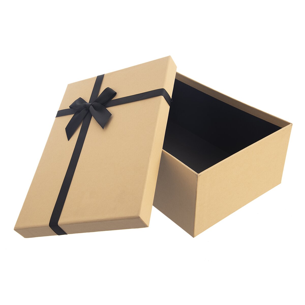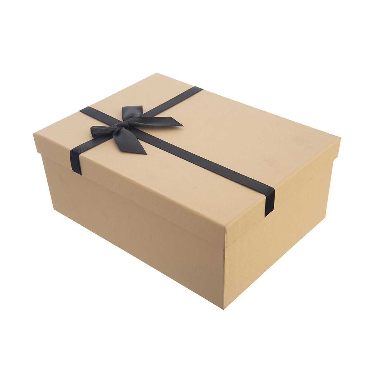 Mäkké a nepravidelné darčeky, originálne darčeky domácej výroby, kozmetiku a napríklad aj fľašu dobrého rumu spolu s ďalšími pochutinami jednoducho uložíte do papierovej krabice. Táto svetlo hnedá krabica v rozmere 30x21x12 cm je vyrobená z pevného kraftového papiera a zdobí ju na veku čierna stuha z polyesteru.