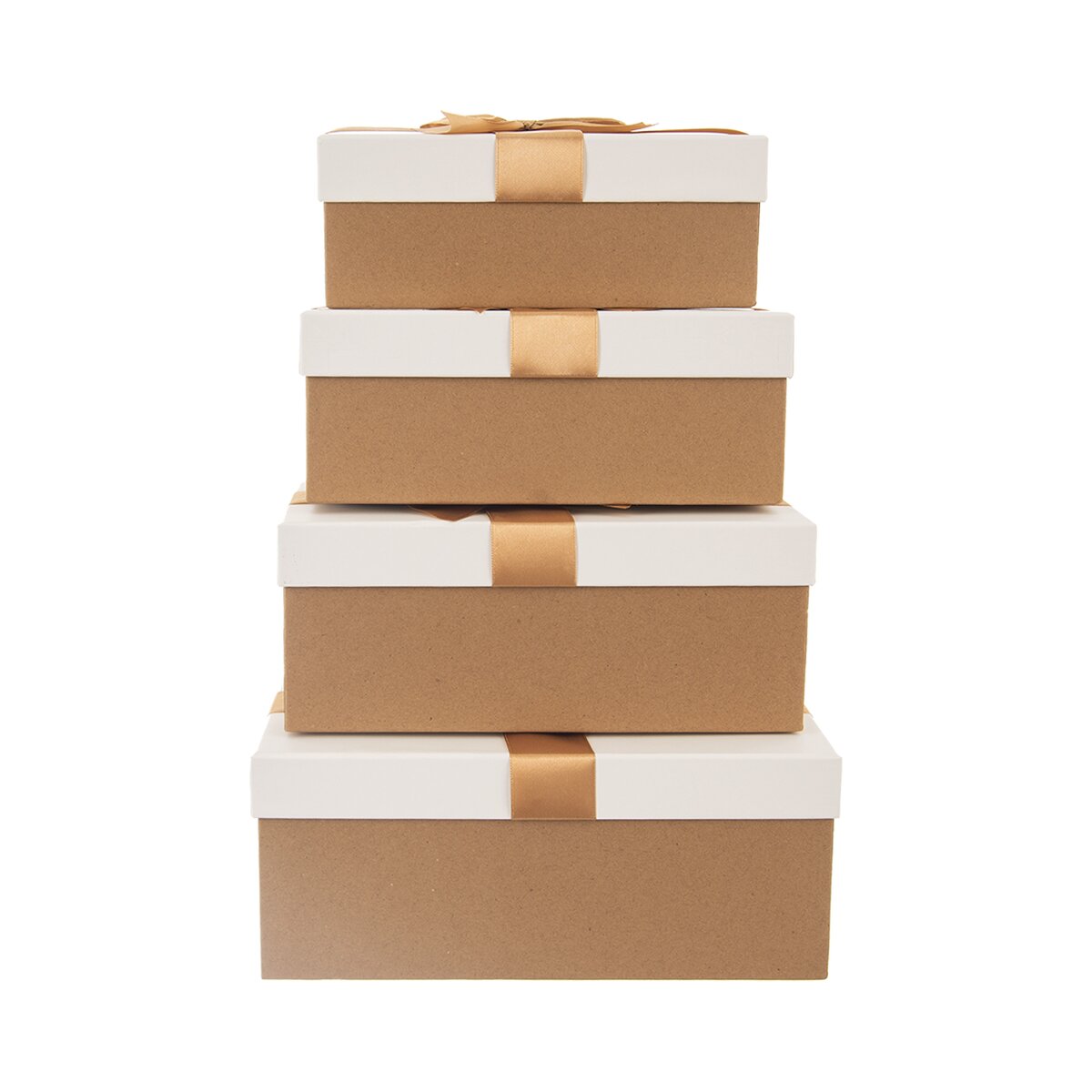 Kód produktu 822714Sada štyroch bielo-zlatých darčekových krabíc s vekom a dekoračnou stuhou. Každá škatuľa má iný rozmer.