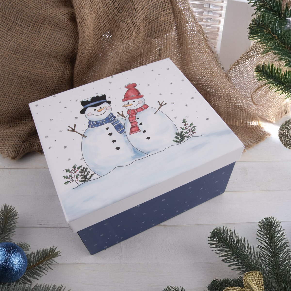 Kód produktu 823104Originálna modrá papierová krabica SNEHULIAK má biele veko s milým motívom dvoch snehuliakov. Je určená na pohodlné balenie darčekov.