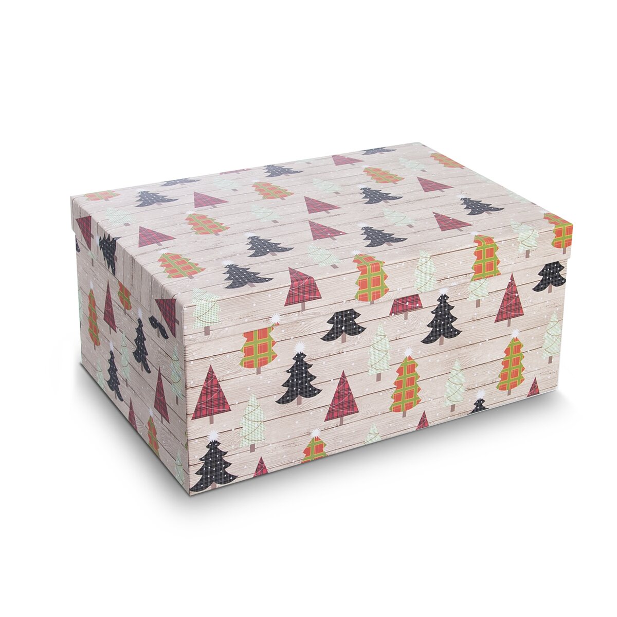 Sú vyrobené z pevného papiera a zdobí ich farebný dekor vianočných stromčekov. Sada obsahuje desať krabíc v rôznych veľkostiach.