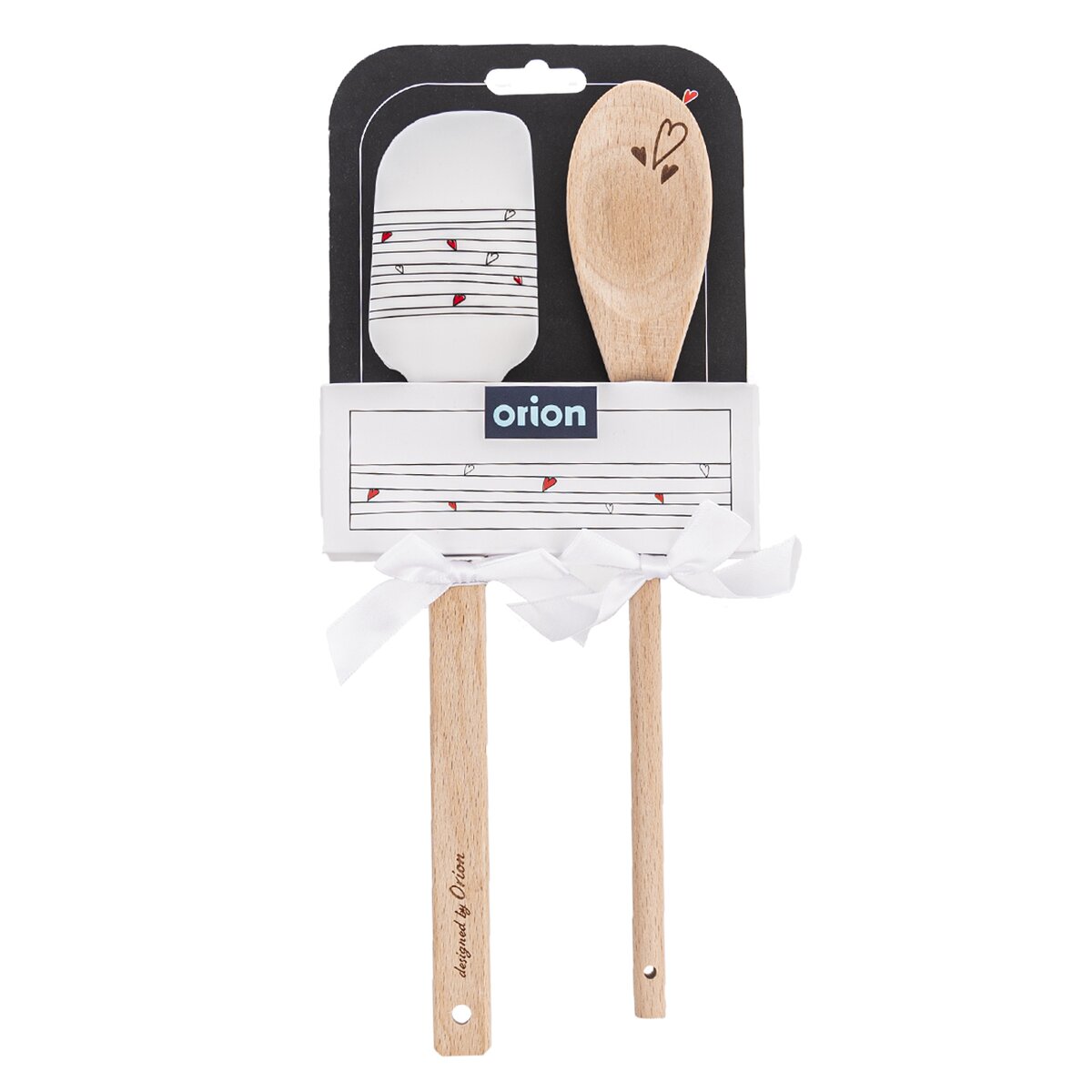 Kód produktu 142841Sada silikónovej kuchynskej stierky a drevenej varešky s motívom drobných sŕdc môže byť skvelým darčekom alebo pozornosťou pre začínajúcich alebo skúsených kuchárov a kuchárky.