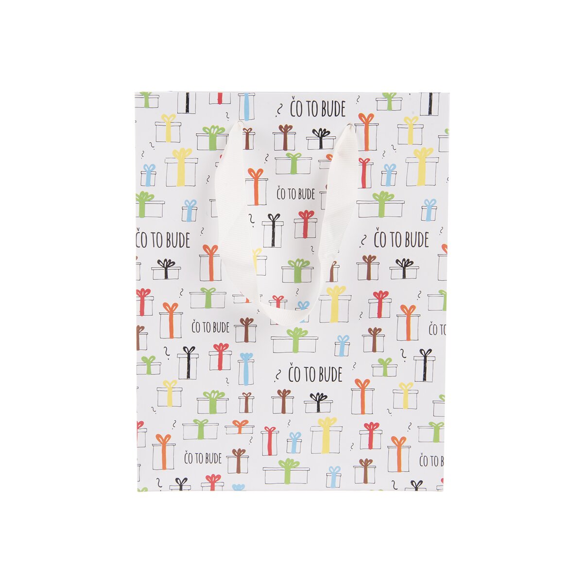 Kód produktu 822761Papierová darčeková taška ČO TO BUDE s rozmermi 18x10x23 cm s originálnou potlačou je vhodná na uloženie najrôznejších darčekov.