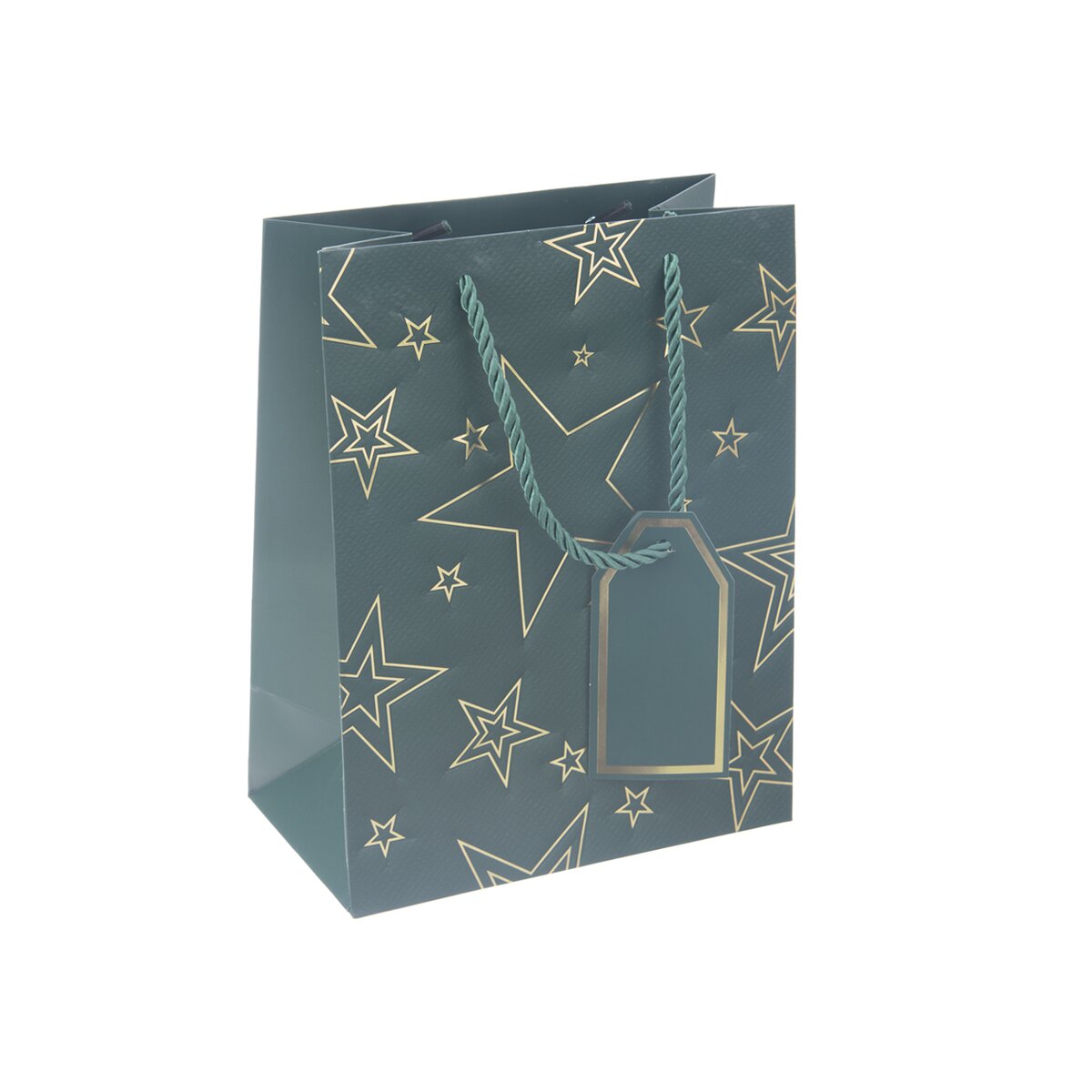 Kód produktu 822744Menšia papierová darčeková taška s rozmermi 18x10x23 cm je v zelenom prevedení, zdobená zlatými linkami hviezd.