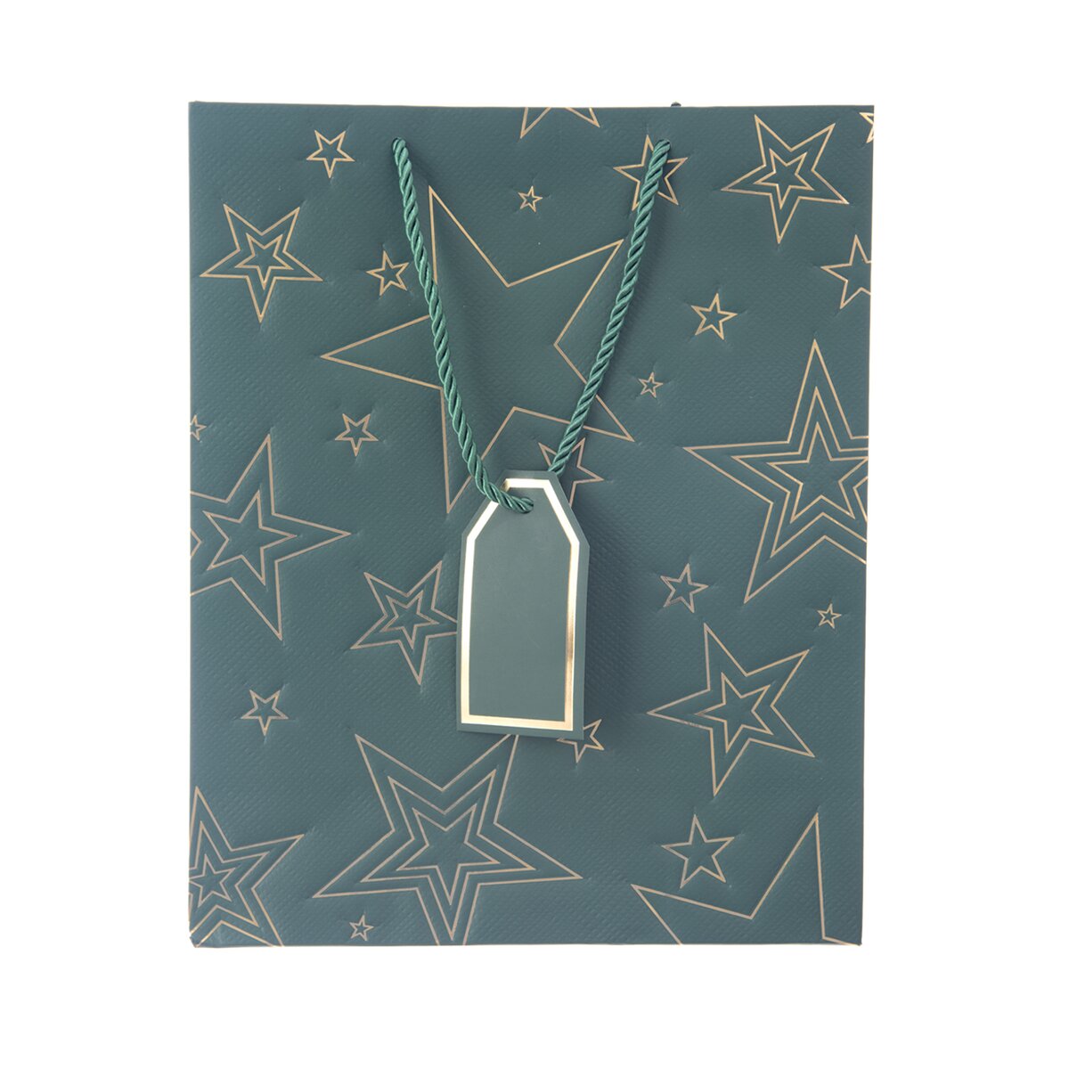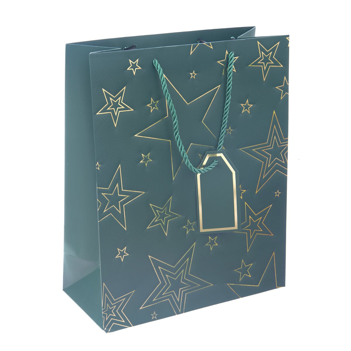 Kód produktu 822747Väčšia papierová darčeková taška s rozmermi 26x12x32 cm je v zelenom prevedení, zdobená zlatými linkami v tvare hviezd.