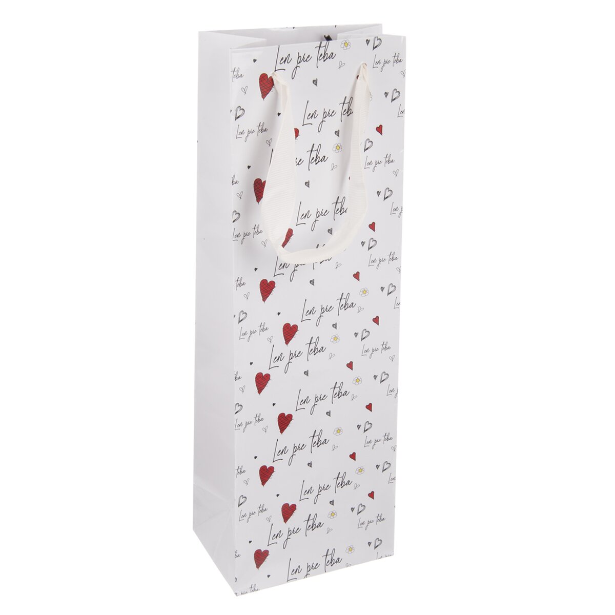 Užšia darčeková taška LEN PRE TEBA je skvelým miestom na uloženie dobrého vína, pálenky, obľúbeného likéru alebo domácej šťavy v zaujímavej fľaši. Napríklad pre partnera, kamarátku, kolegu, pri narodeninách alebo výročí.