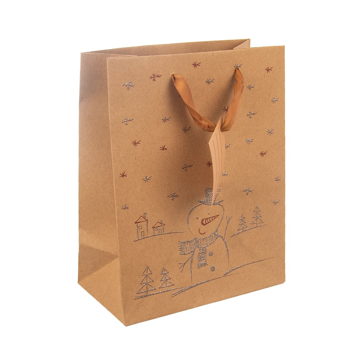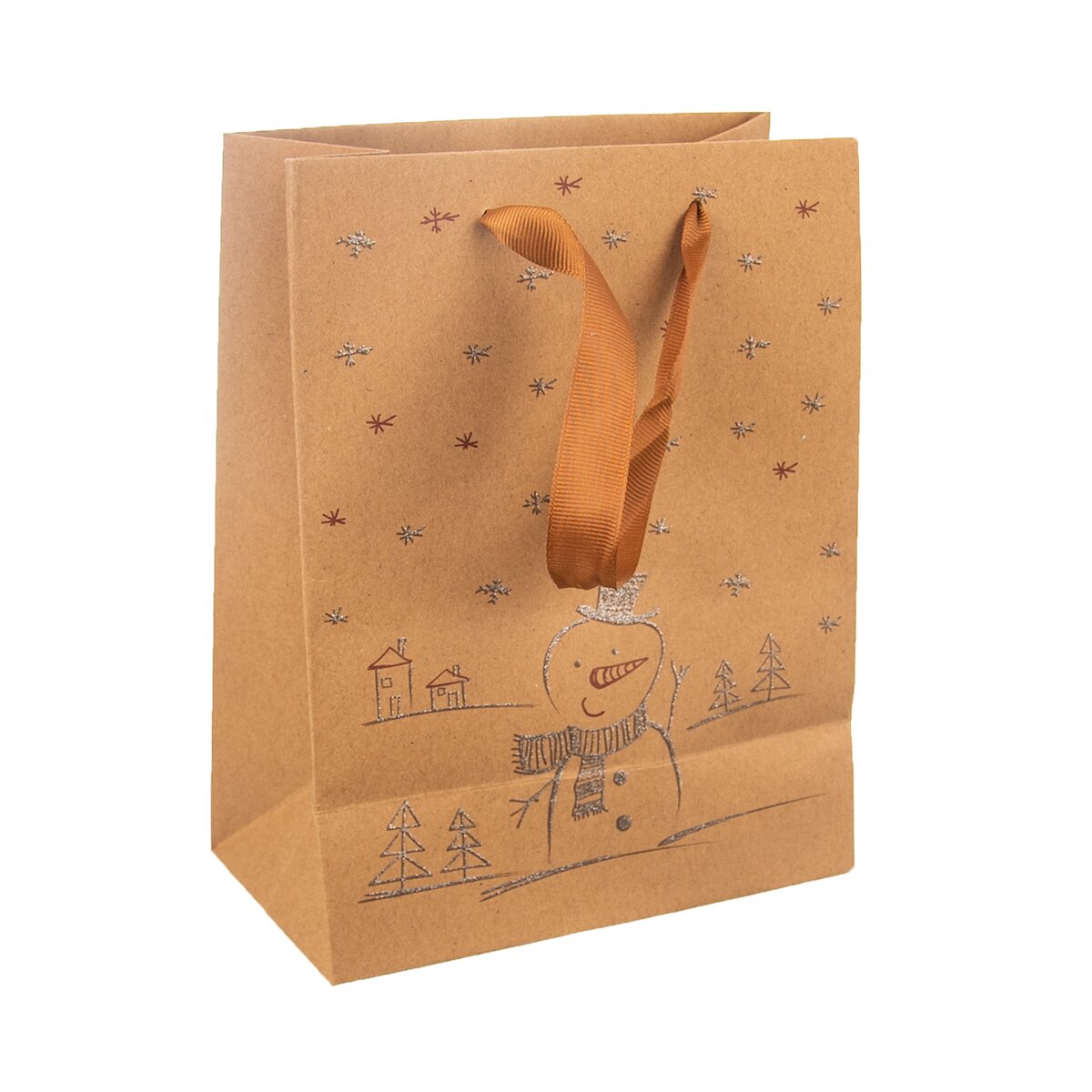 Papierová taška veľkosti 18x10x23 cm zaujme svojim jemným dekorom padajúcich vločiek a snehuliaka. Taška má tiež papierovú ceduľku s voľným miestom na vypísanie mena a mašľu namiesto ucha.
