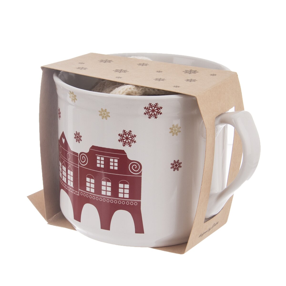 Ak znova neviete, čo kúpiť za darček, vyrieši to za vás tento vtipný a praktický set, ktorý zaistí poriadnu dávku pitného režimu a nohy v teple. Obsahuje biely keramický hrnček Varák s objemom 500 ml s krásnym dekorom červených domčekov a snehových vločiek. Vďaka rovnému dnu bez glazúry ho môžete použiť na ohrievanie nápoja na elektrickom sporáku či kachliach.