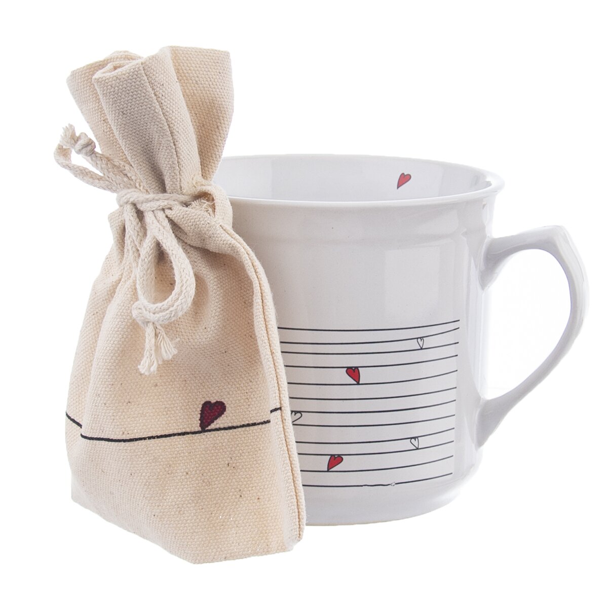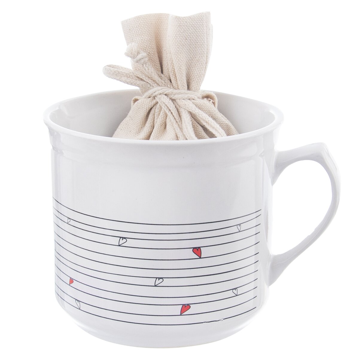 Kód produktu 128852Biely keramický hrnček s objemom 0,5 l, s dekorom liniek a srdiečok, je doplnený vrecúškom na sypaný čaj alebo sušené bylinky. Krásny a zároveň praktický darček nielen pre milovníkov čaju.
