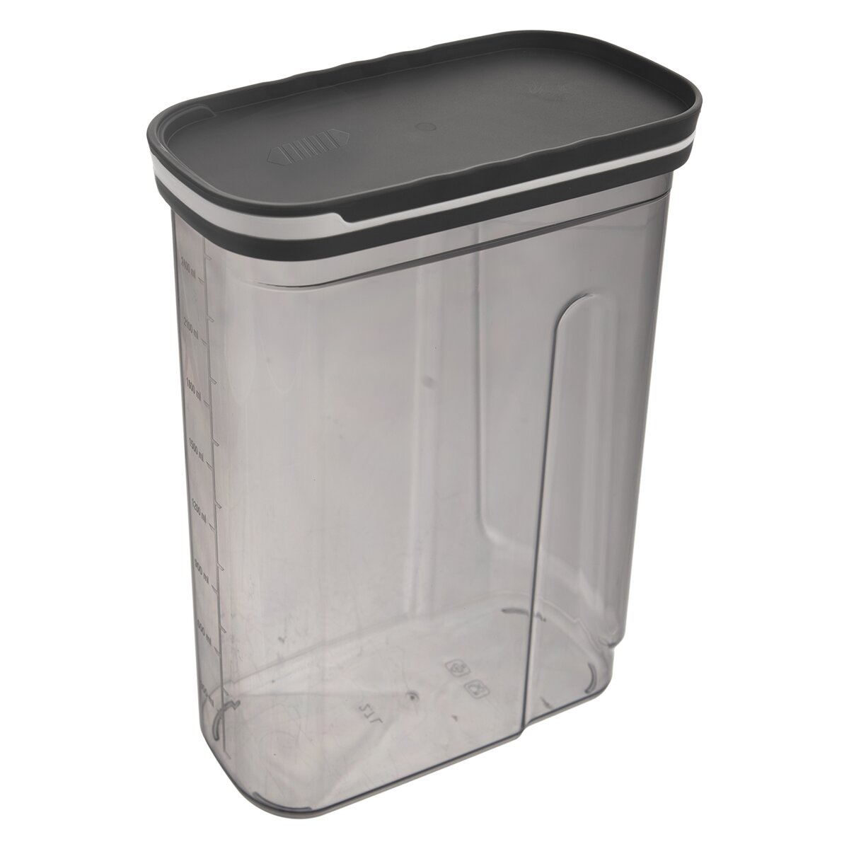 Kód produktu 127171Plastová šedá dóza GREY s objemom 2,7 l, s dávkovacím posuvným uzáverom, je vhodná na uloženie špagiet, múky, strukovín aj cereálií. Vyznačená odmerka na strane po 300 ml.